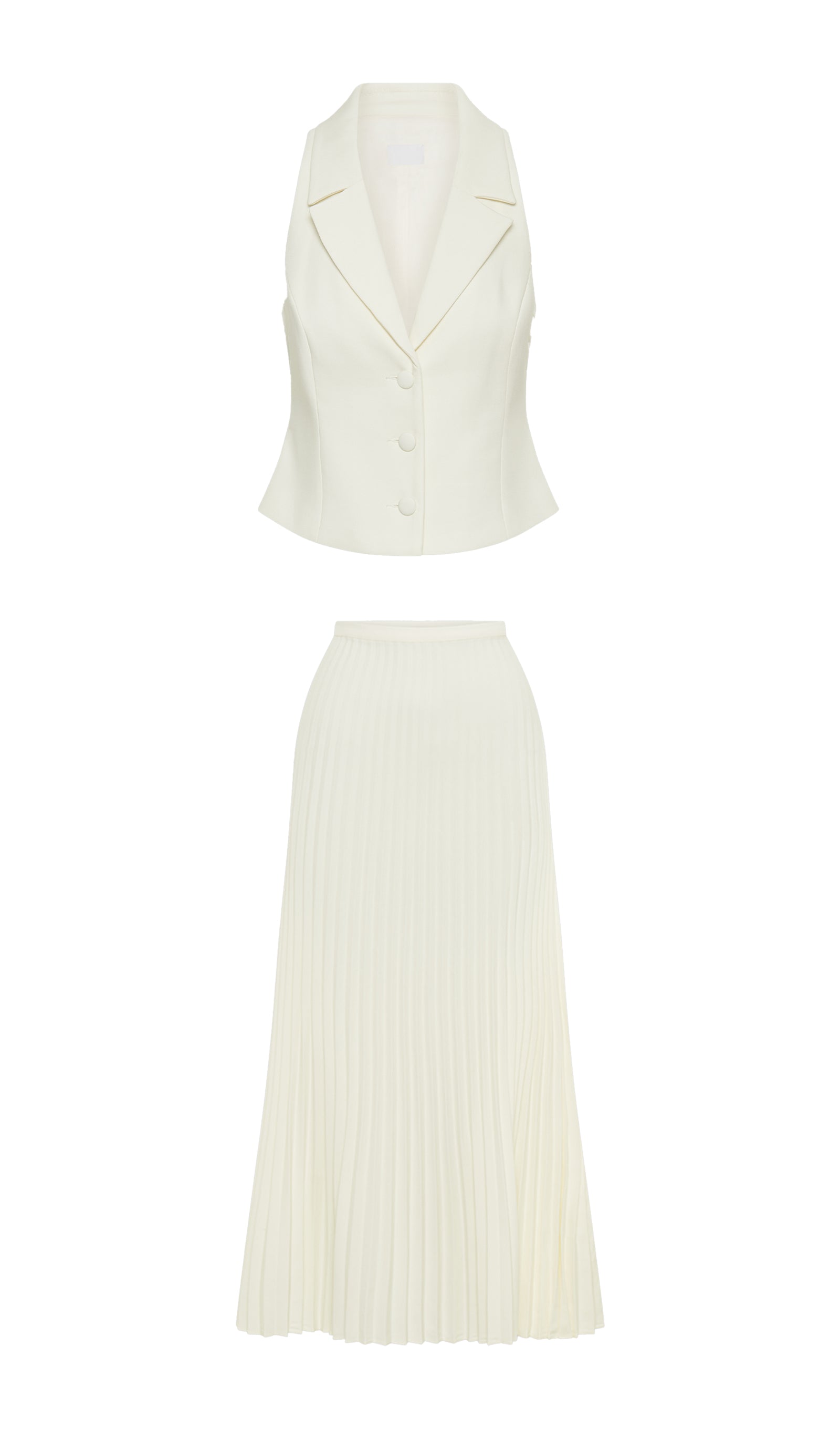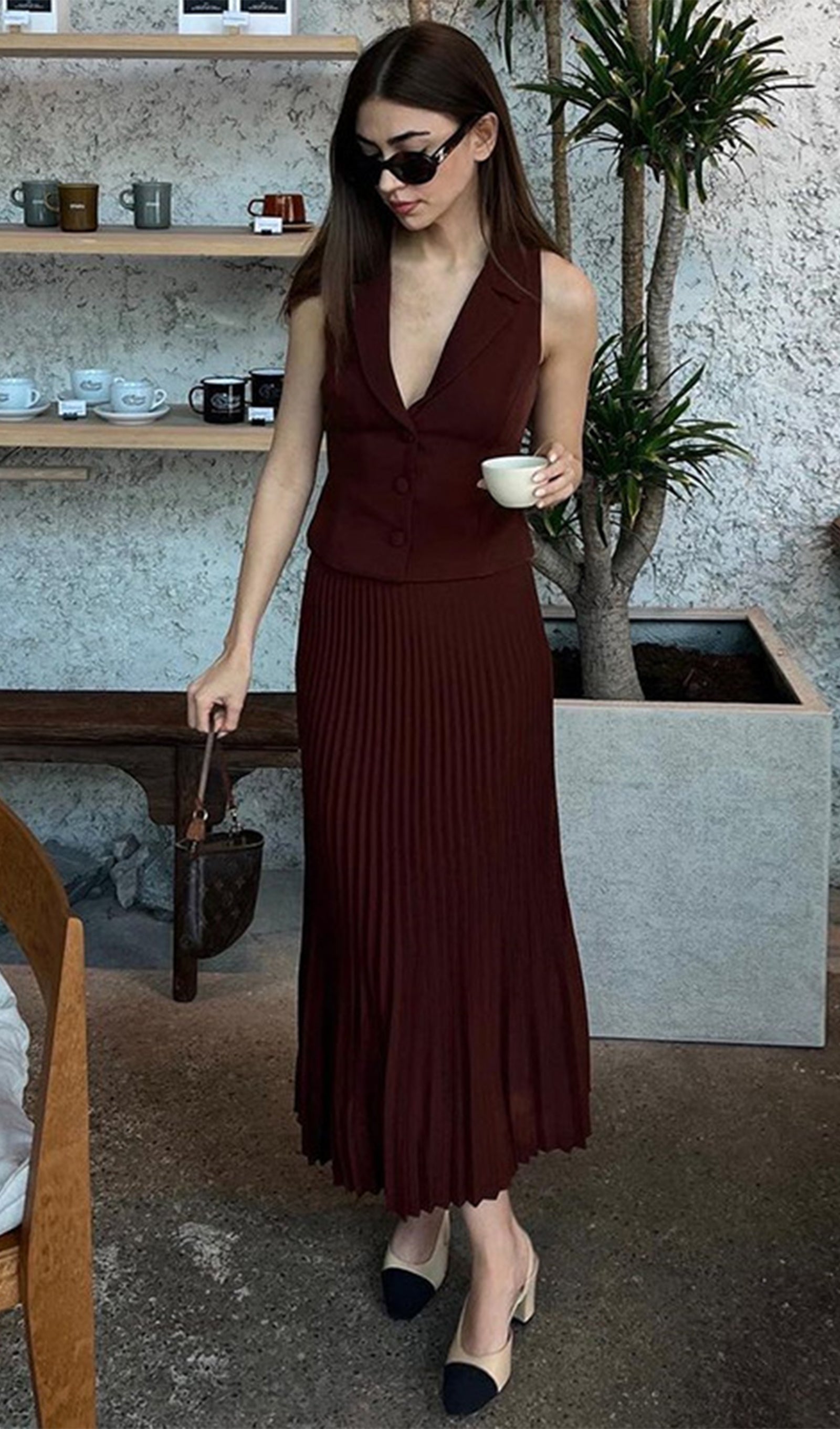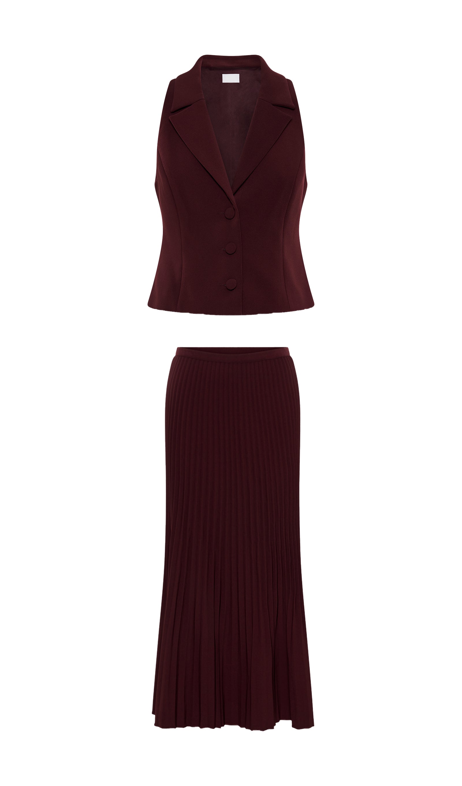 Üst kısmı kolsuz, tek düğmeli, derin V yakalı ve fonksiyonel ön düğmeli bir takım elbise yeleğidir. Yakası ve uzun bedeni yumuşak, rahat kumaşa yapı katarak form ve işlevi kusursuz bir şekilde harmanlıyor. Siluet bir takım elbise klasiğidir - temiz çizgiler, pürüzsüz kenarlar ve ince detaylar.