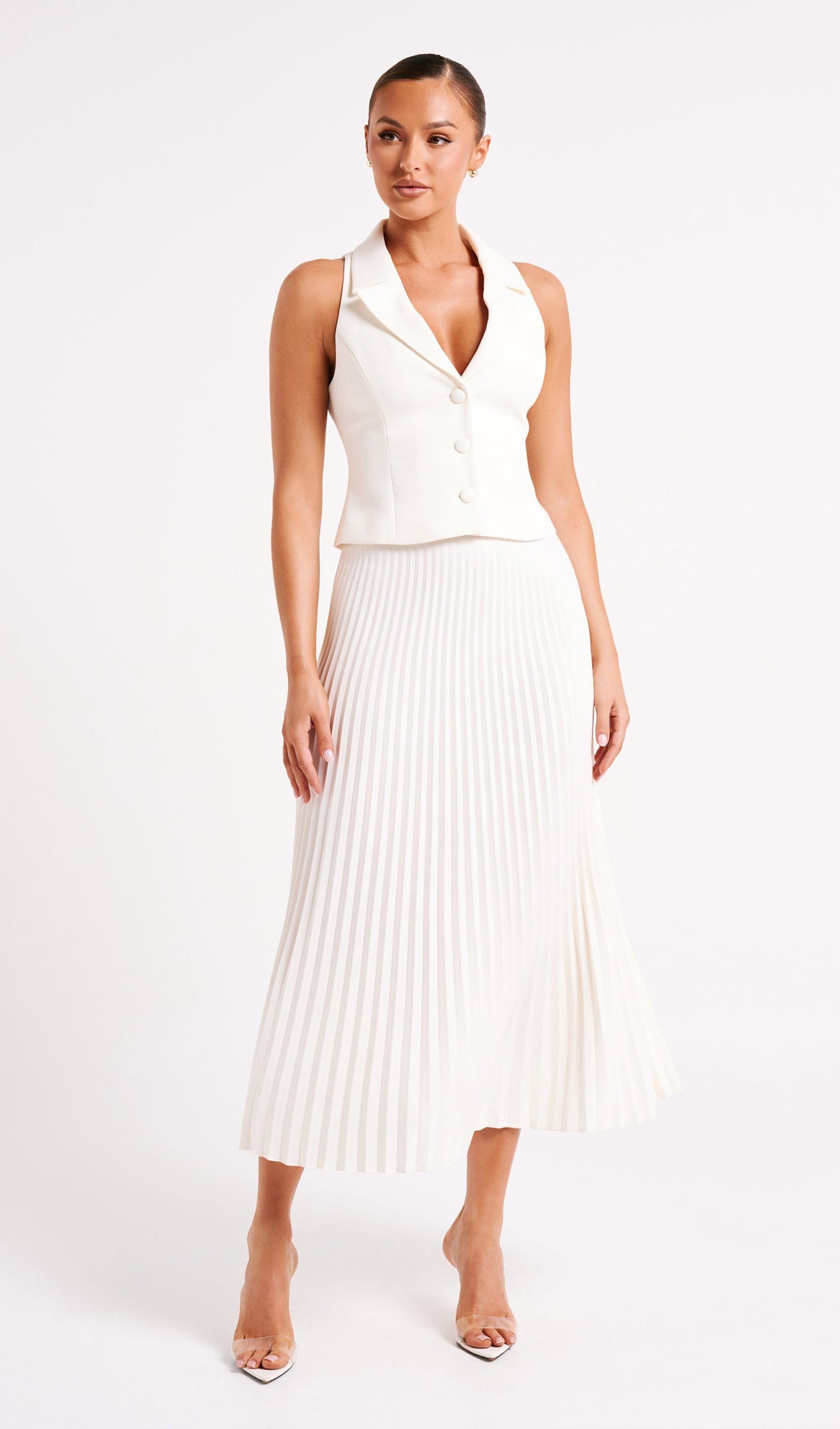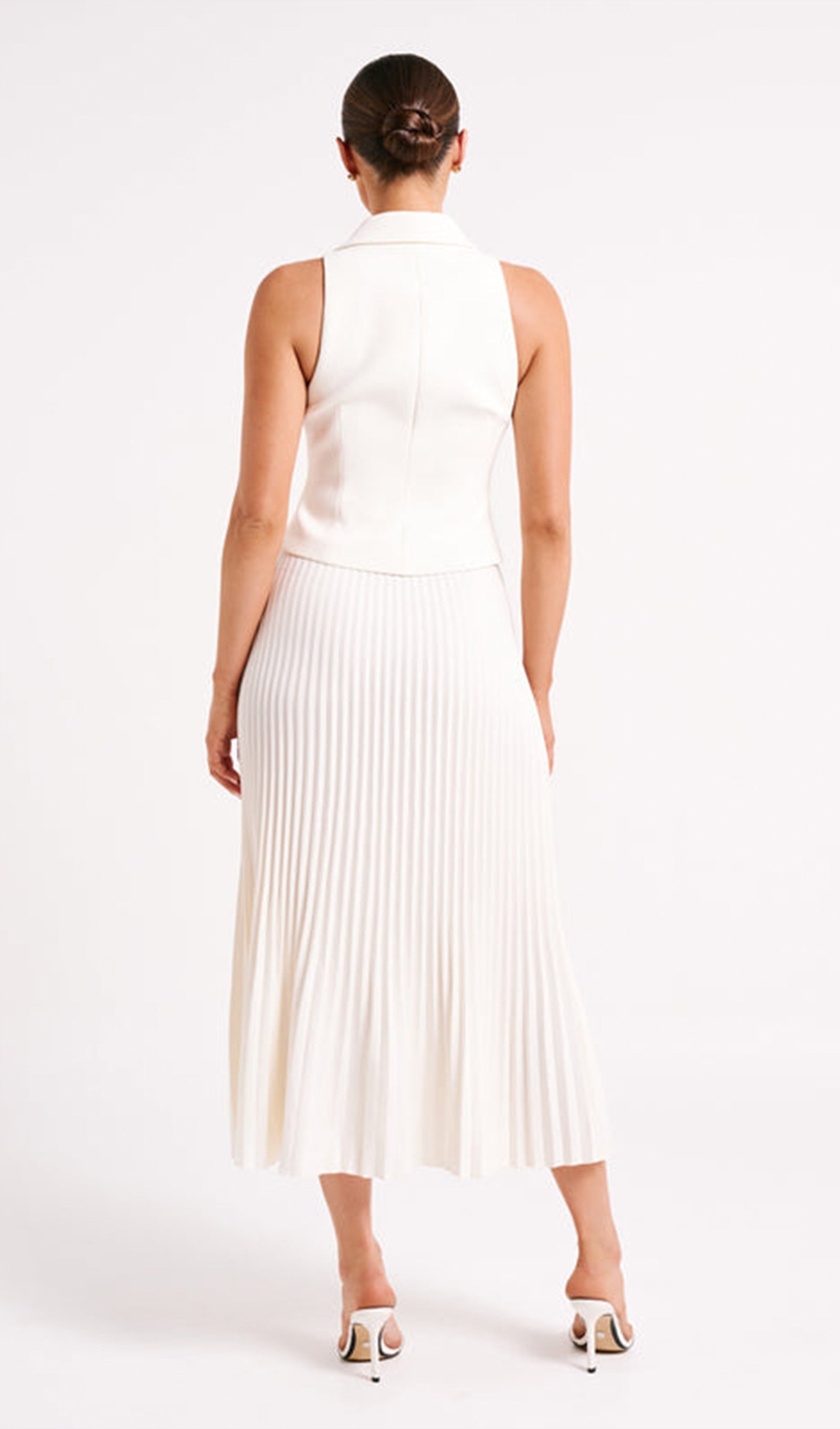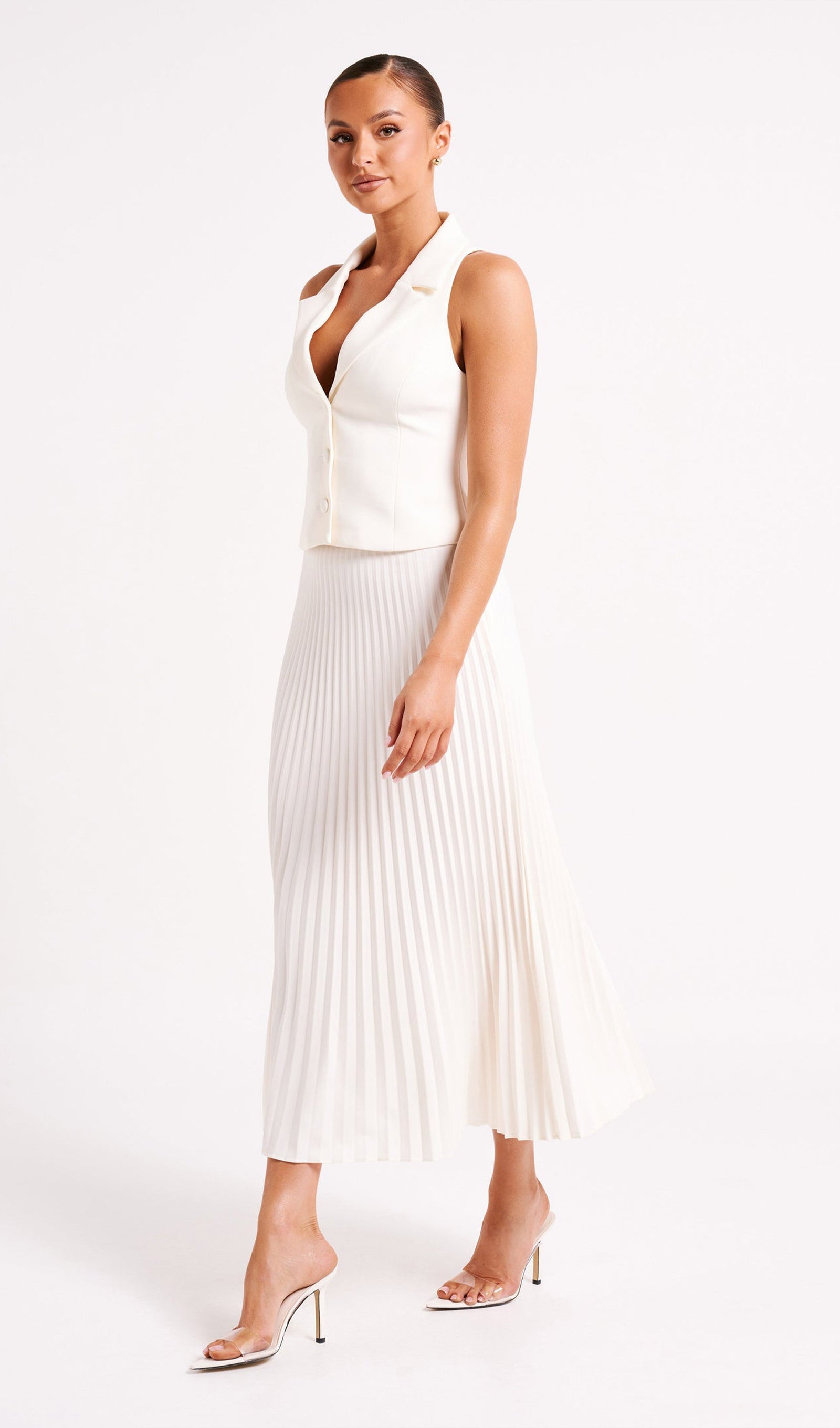 Üst kısmı kolsuz, tek düğmeli, derin V yakalı ve fonksiyonel ön düğmeli bir takım elbise yeleğidir. Yakası ve uzun bedeni yumuşak, rahat kumaşa yapı katarak form ve işlevi kusursuz bir şekilde harmanlıyor. Siluet bir takım elbise klasiğidir - temiz çizgiler, pürüzsüz kenarlar ve ince detaylar.