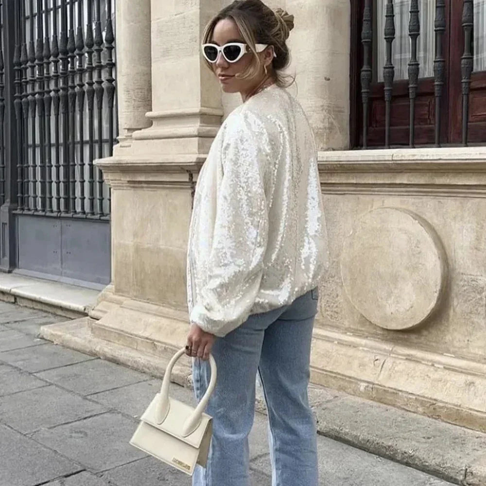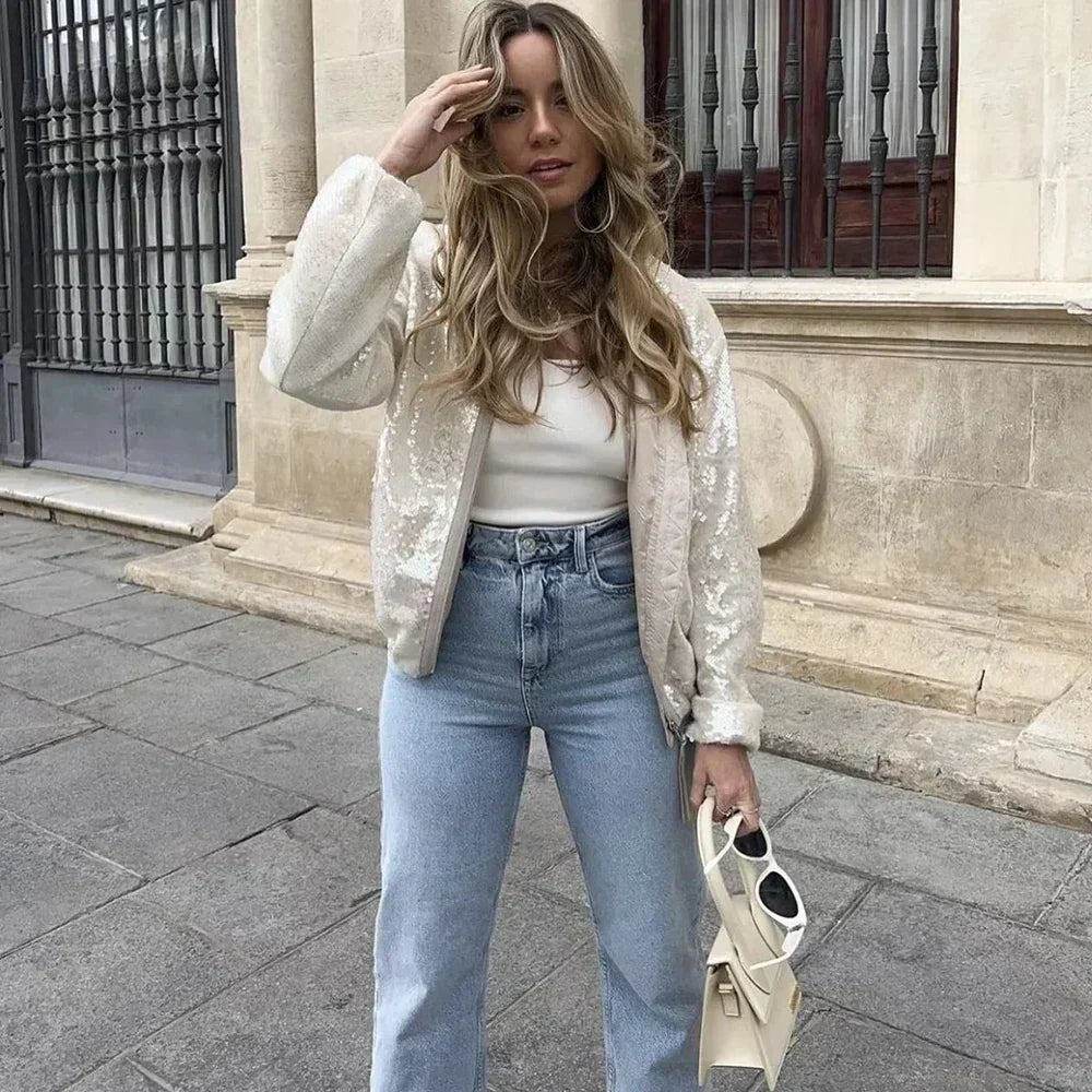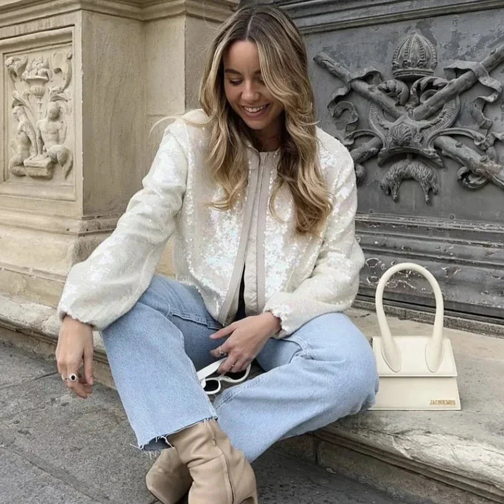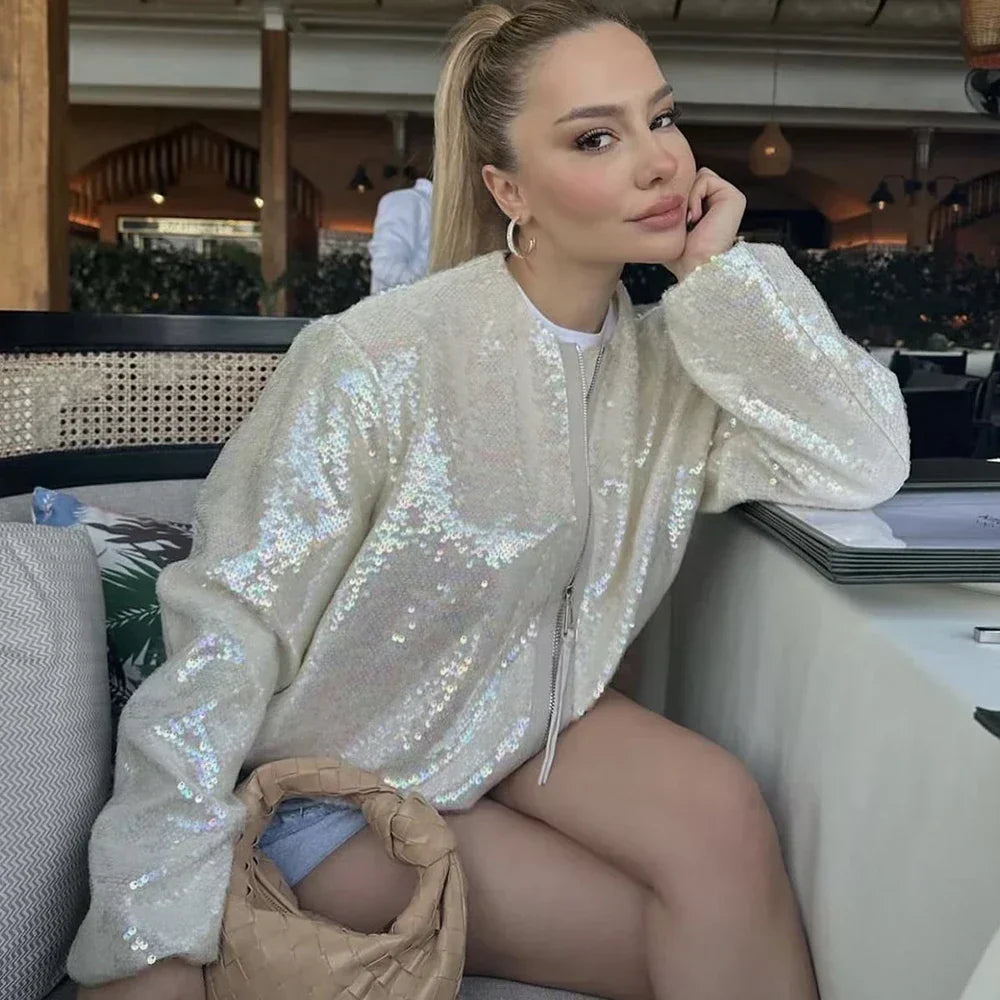 Her adımda ışıldamak isteyenler için tasarlanan payet detaylı ceket, şıklığı ve enerjiyi bir araya getiriyor. İnci beyazı zemin üzerine işlenen ışığı yansıtan payetler, günün her anında dikkat çekici bir stil yaratır. Rahat kesimiyle günlük kombinlerde kullanılabileceği gibi, özel davetlerde de iddialı bir görünüm sunar. Basic parçalarla kombinleyerek modern bir kontrast oluşturabilir ya da gece şıklığınızı tamamlamak için tercih edebilirsiniz.