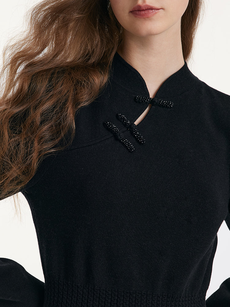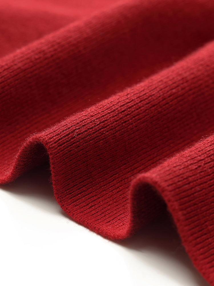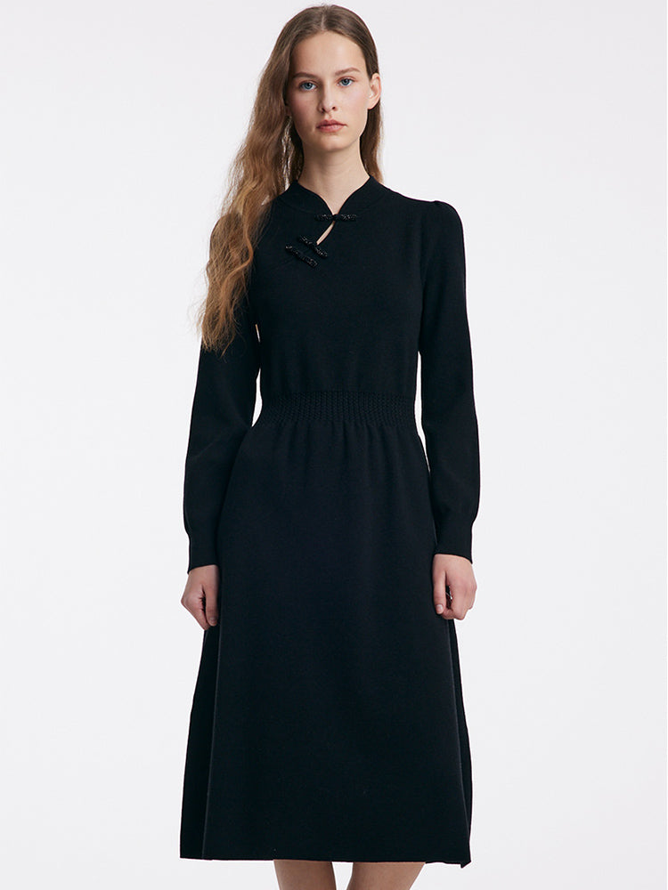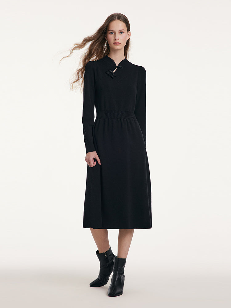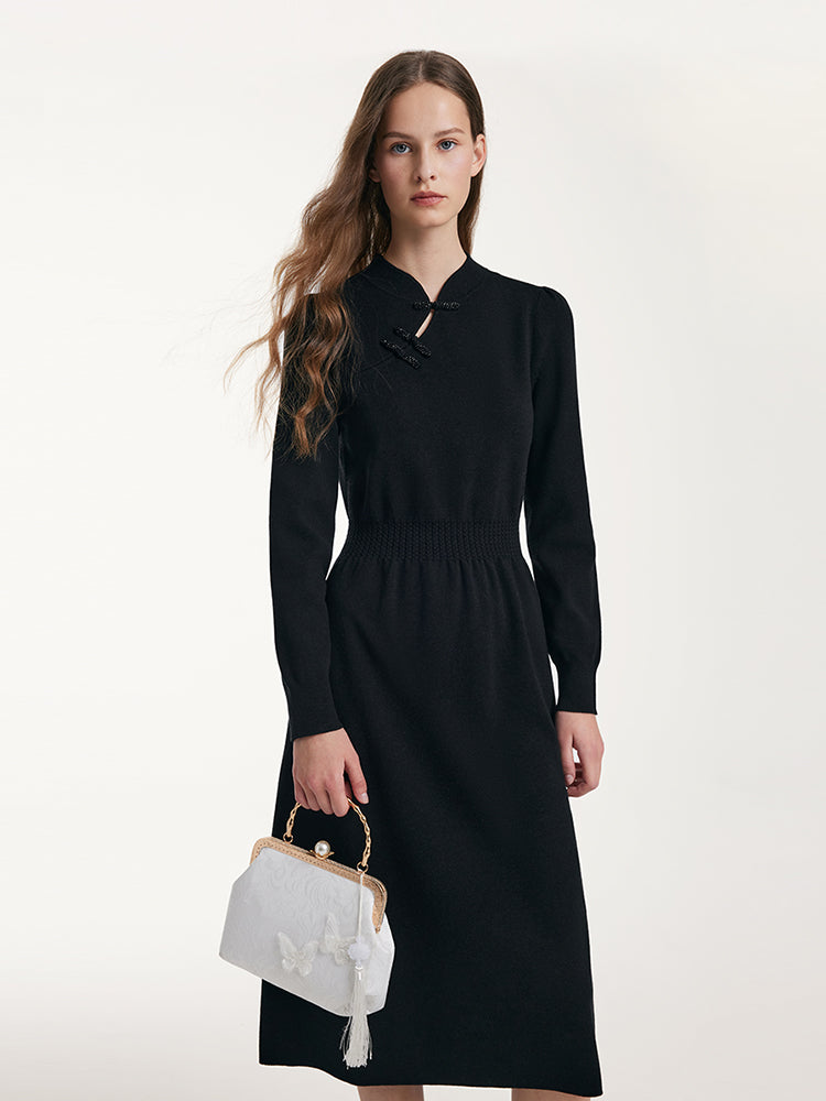Yün Cheongsam Büzgülü Bel Qipao Kırmızı Midi Kışlık Elbise