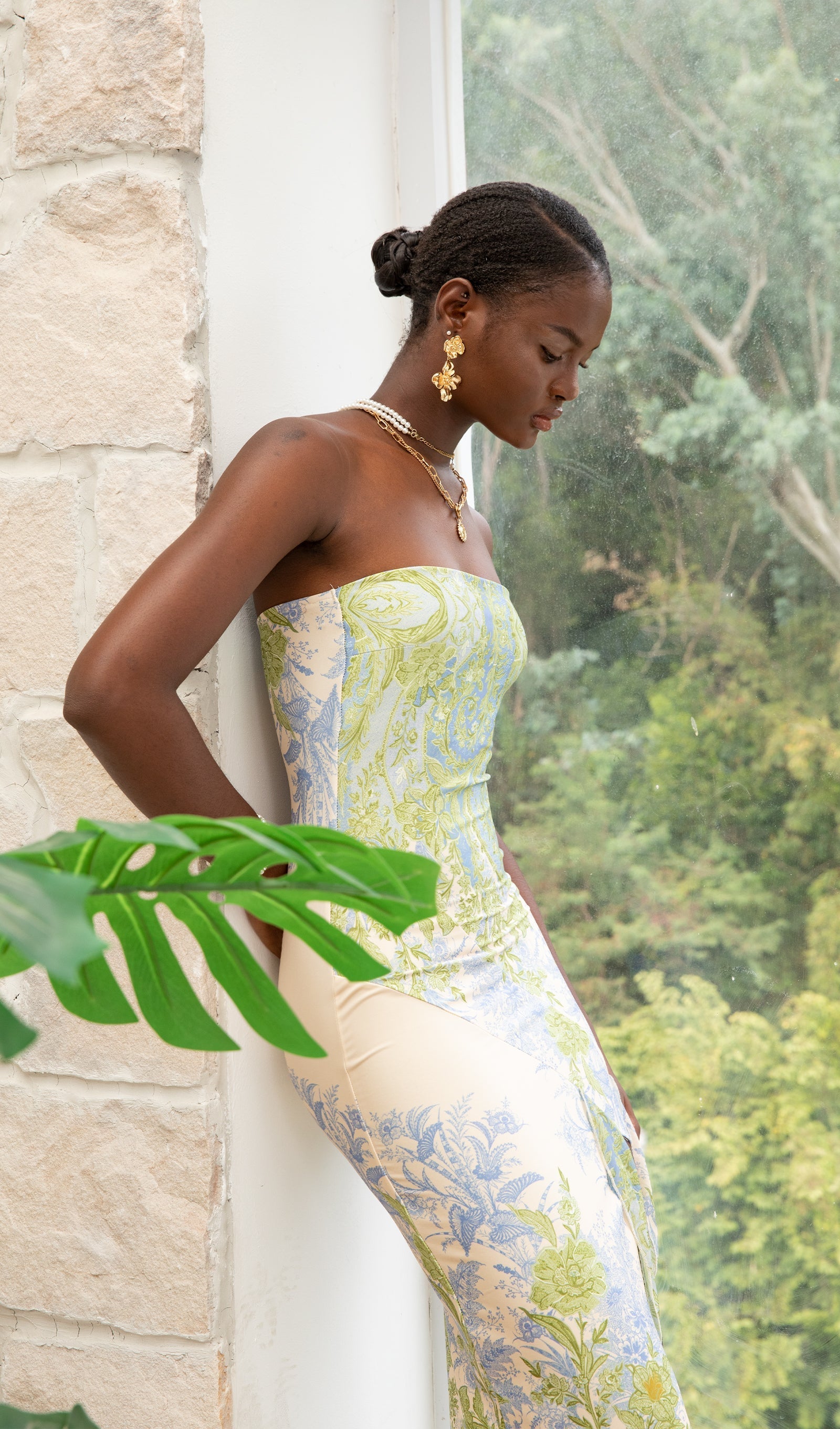 Mavi ve yeşil tonlarında güzel bir toile de jouy desenine sahip bu çarpıcı Baskılı Straplez Yırtmaçlı Midi Elbise ile baş döndürün! Fırfır detayları ve yırtmacı ile kesinlikle büyüleyici görünün ve straplez görünümünüzü sergilemeyi unutmayın! Eğlenceli bir gece için mükemmel - bu türünün tek örneği elbiseyi kaçırmayın!
