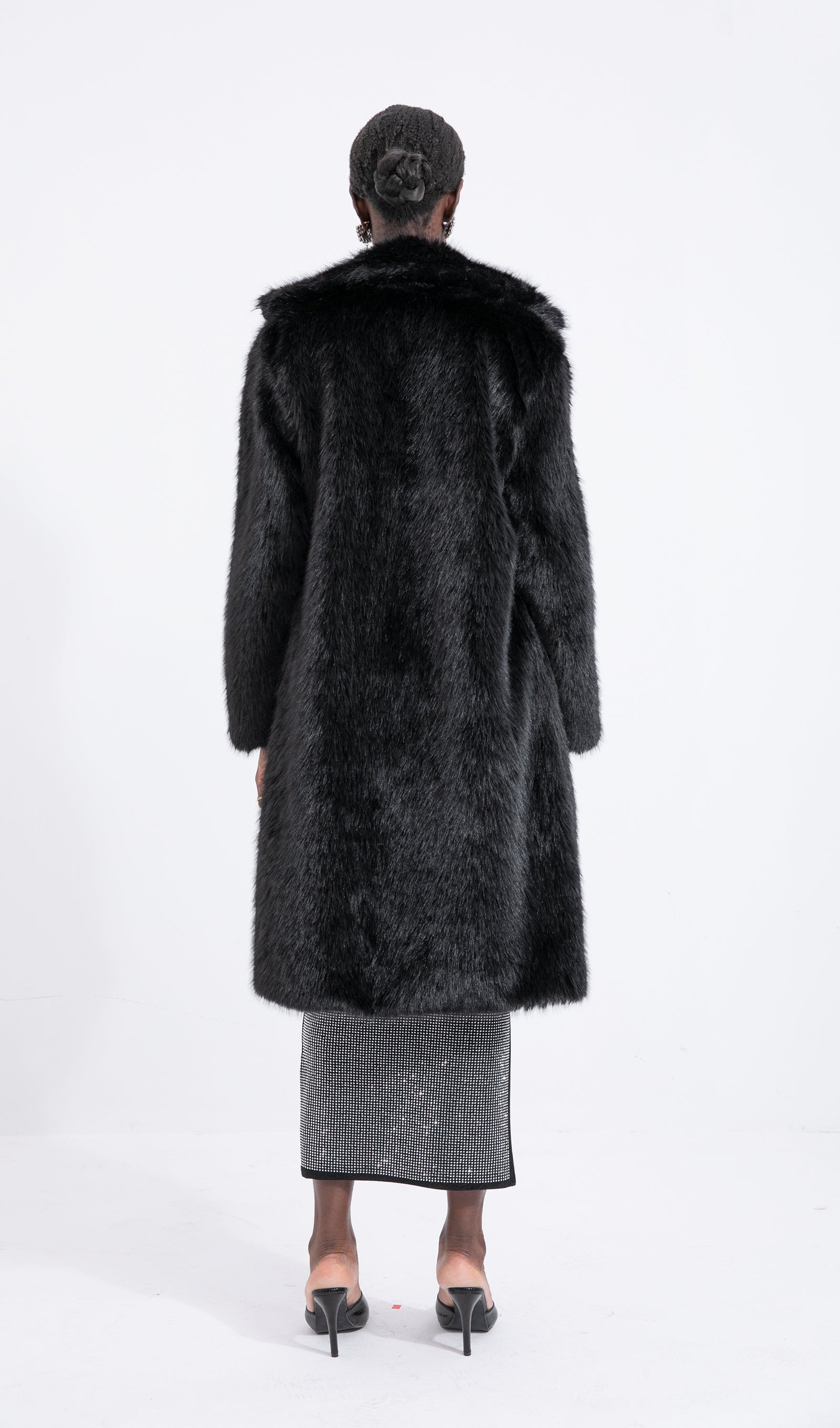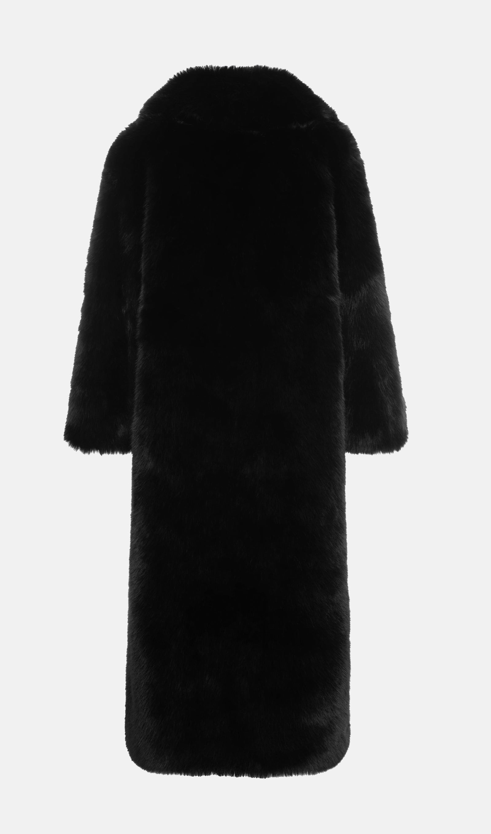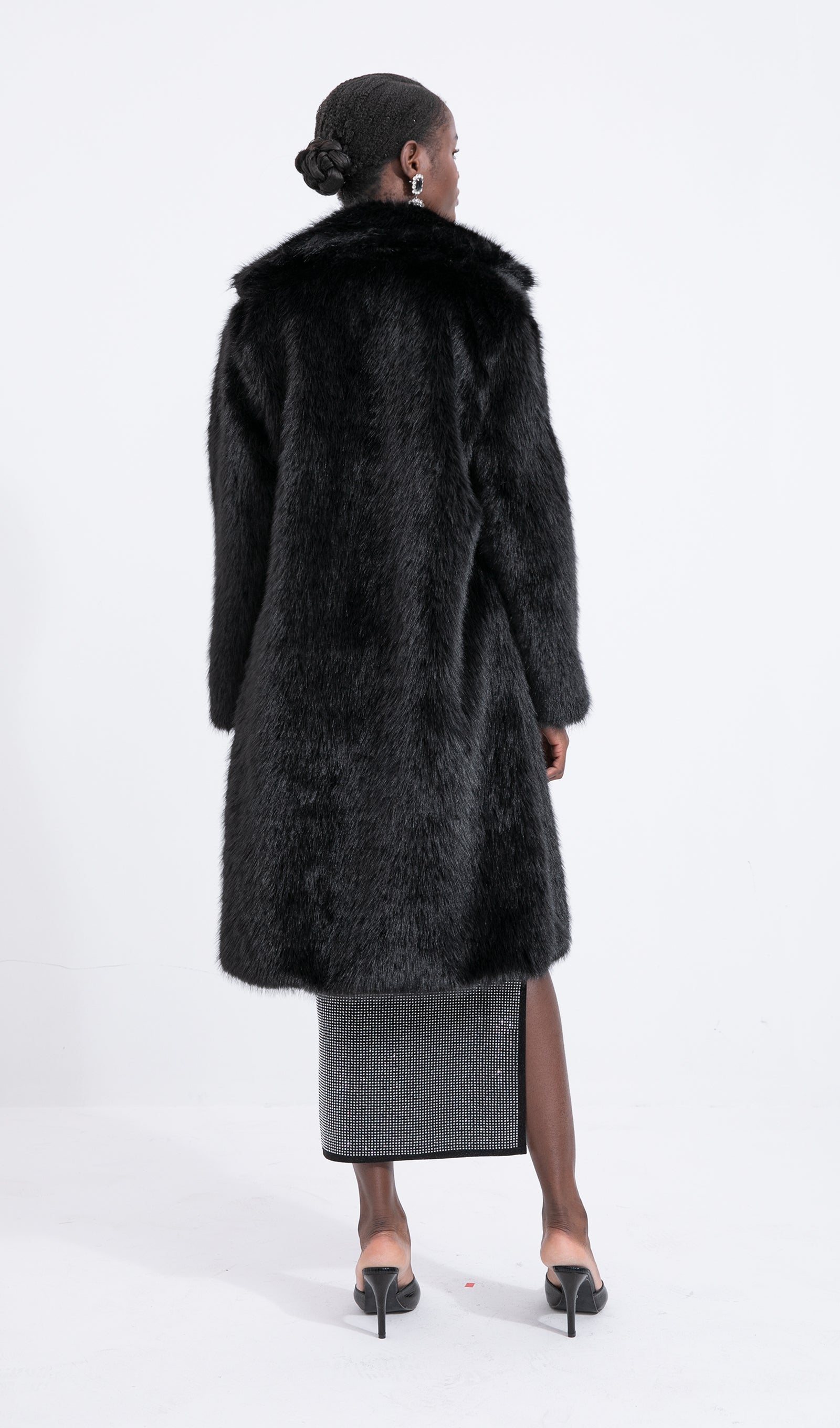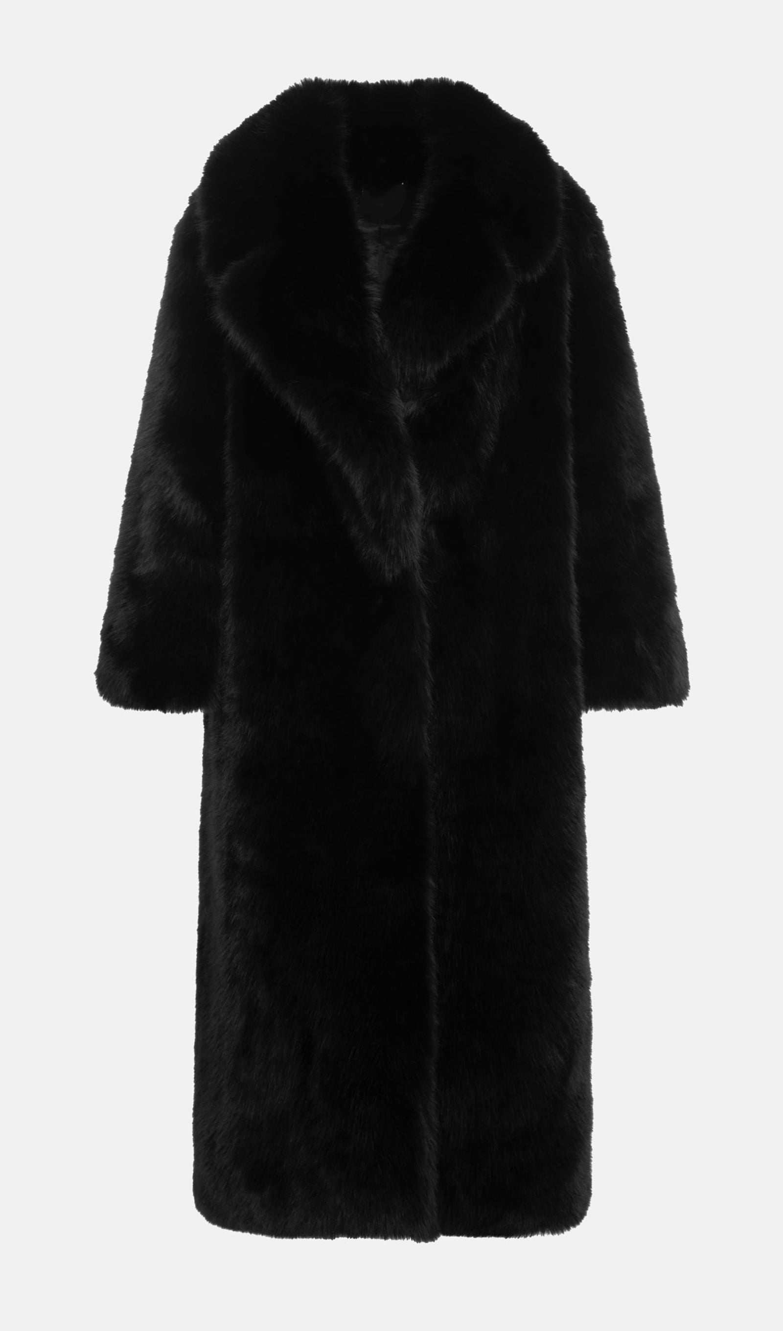 Hacimli yakalı ve rahat kollu, bol kesimli zarif maksi palto, gür tüylü sıcak suni kürkten yapılmıştır.