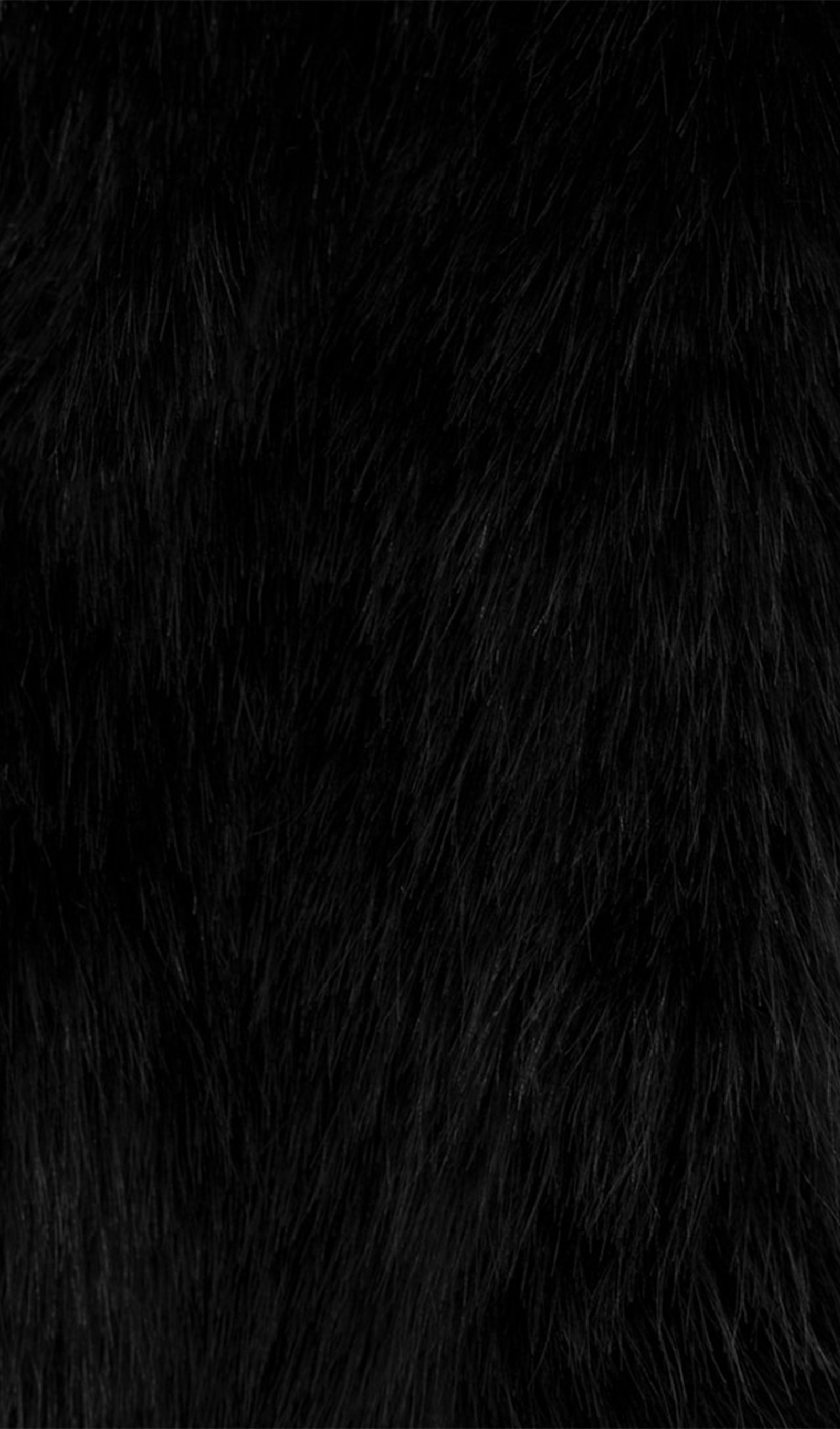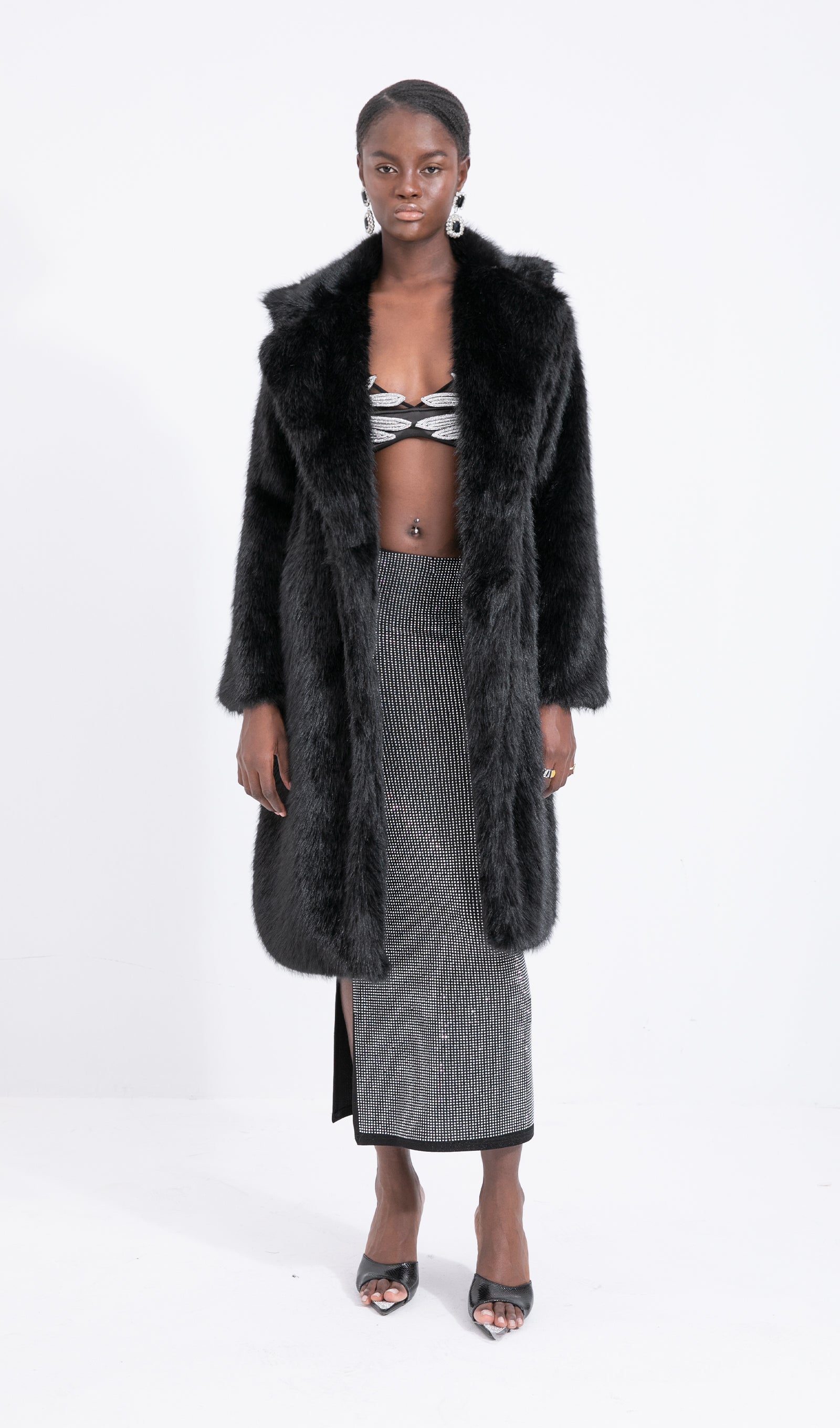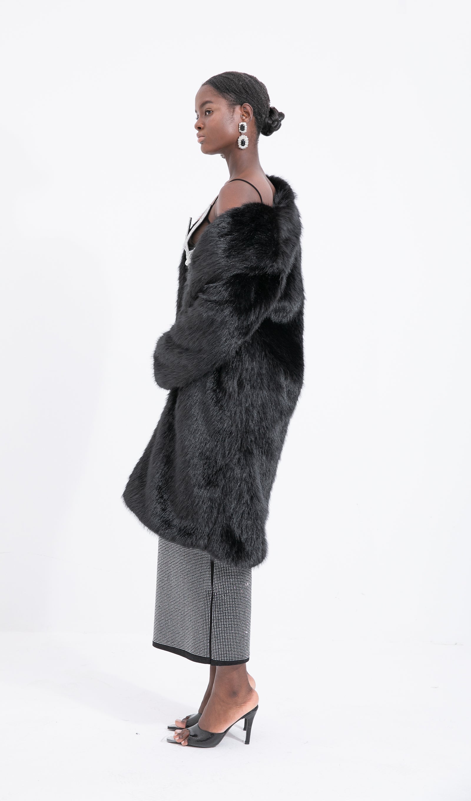Hacimli yakalı ve rahat kollu, bol kesimli zarif maksi palto, gür tüylü sıcak suni kürkten yapılmıştır.