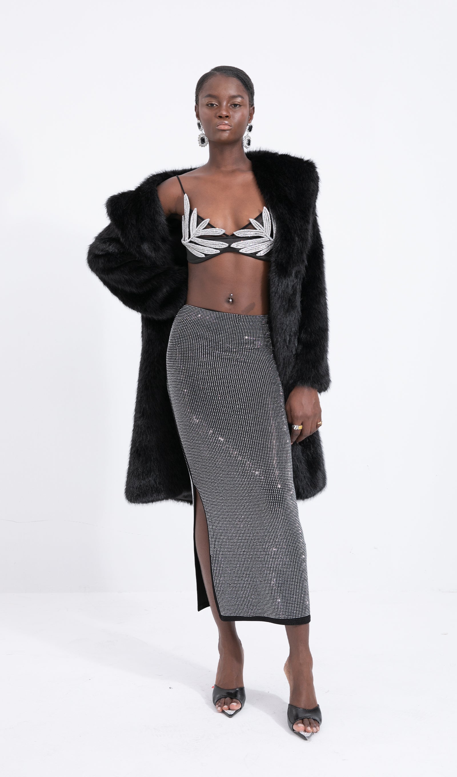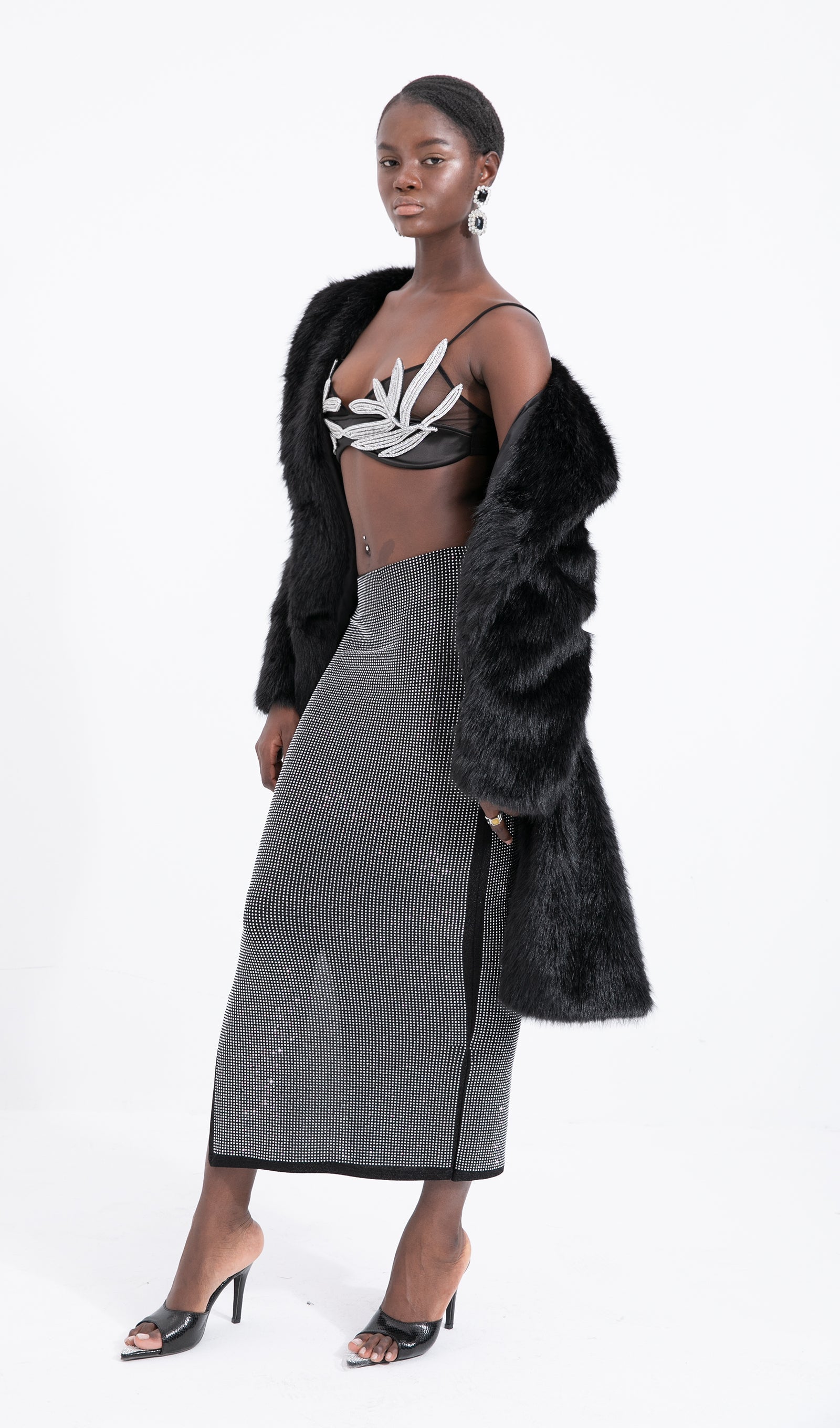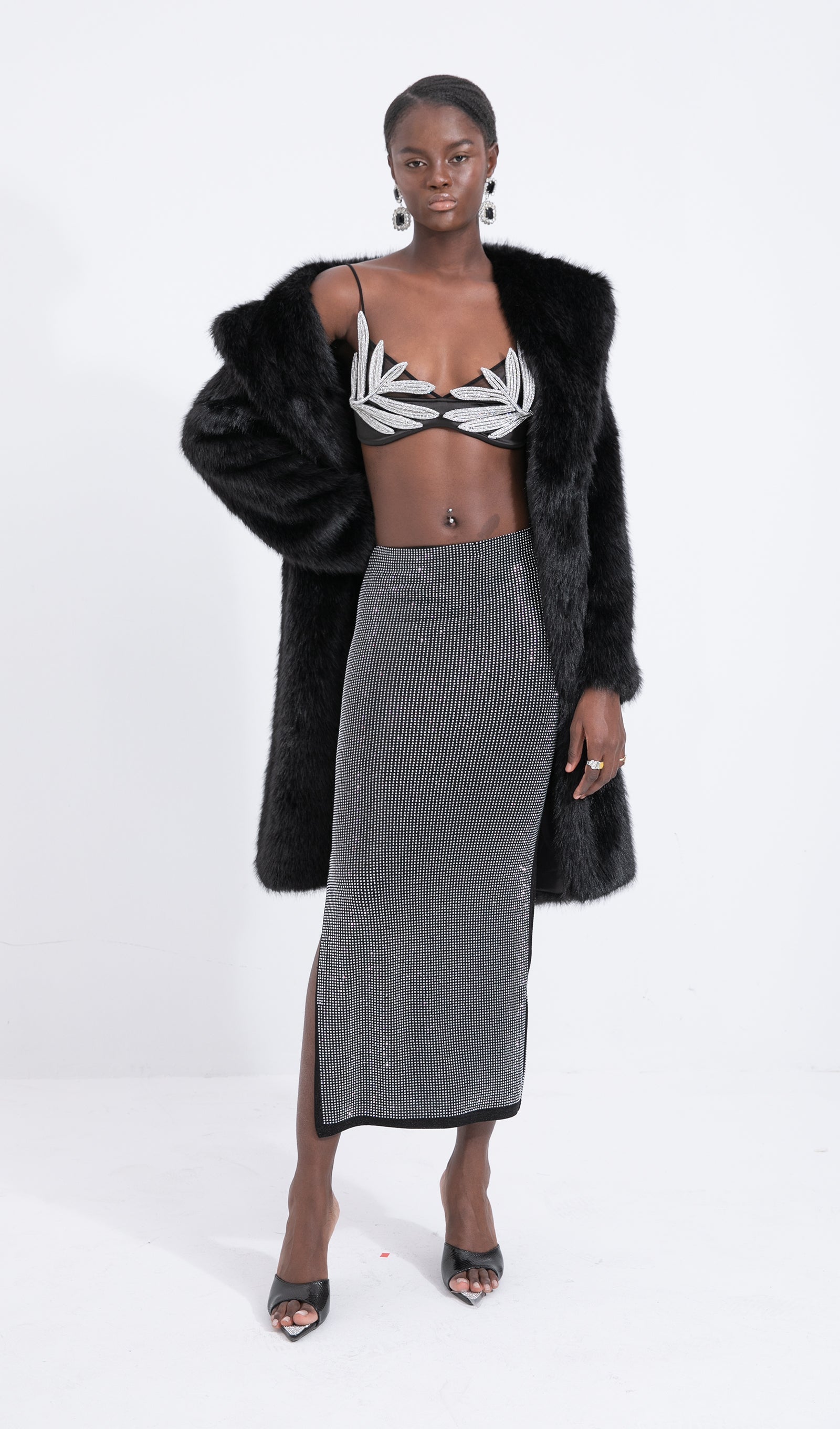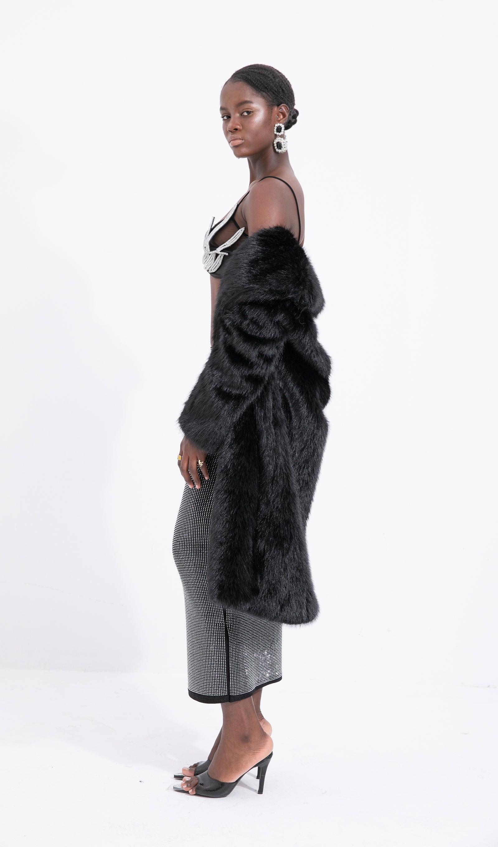 Hacimli yakalı ve rahat kollu, bol kesimli zarif maksi palto, gür tüylü sıcak suni kürkten yapılmıştır.