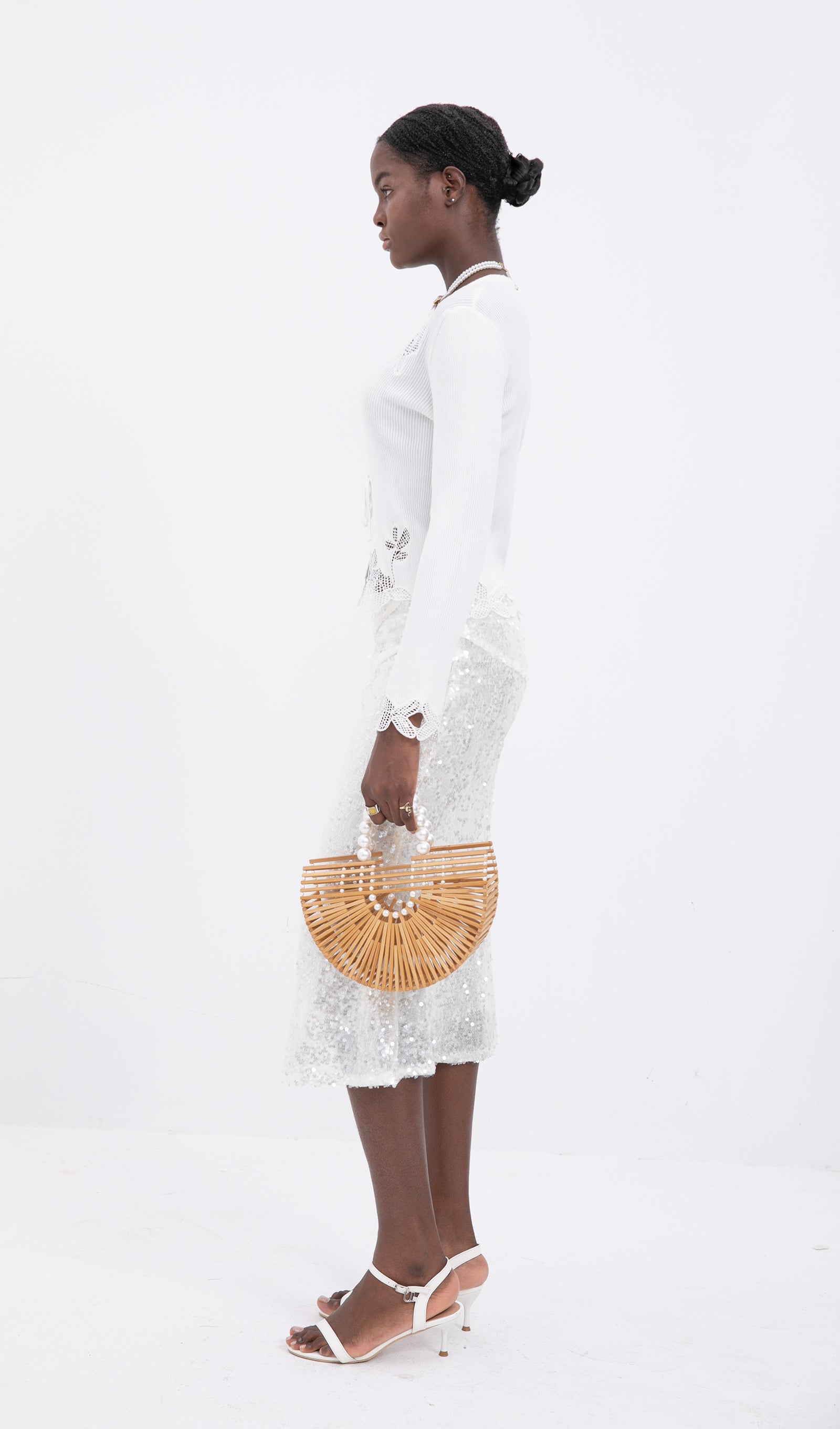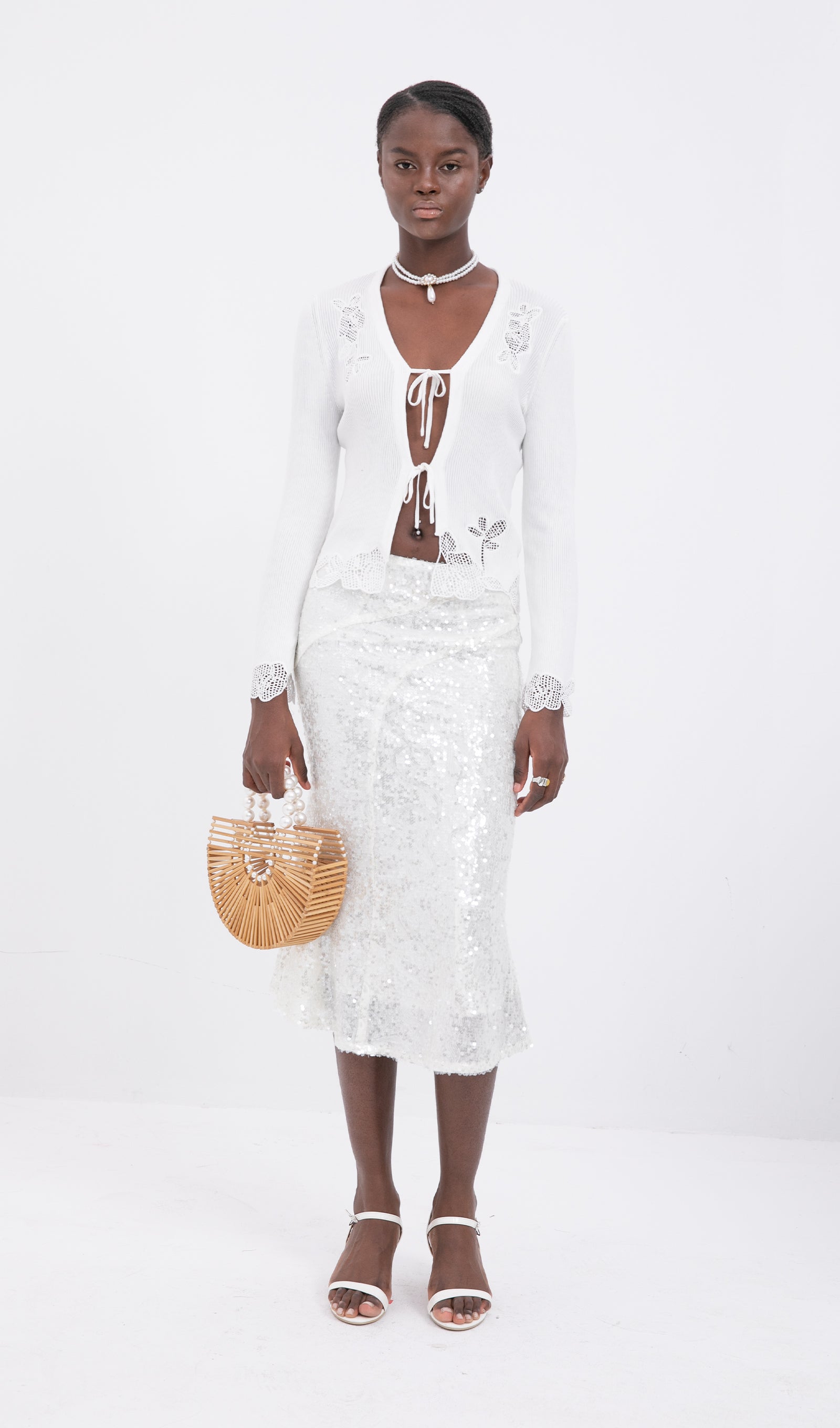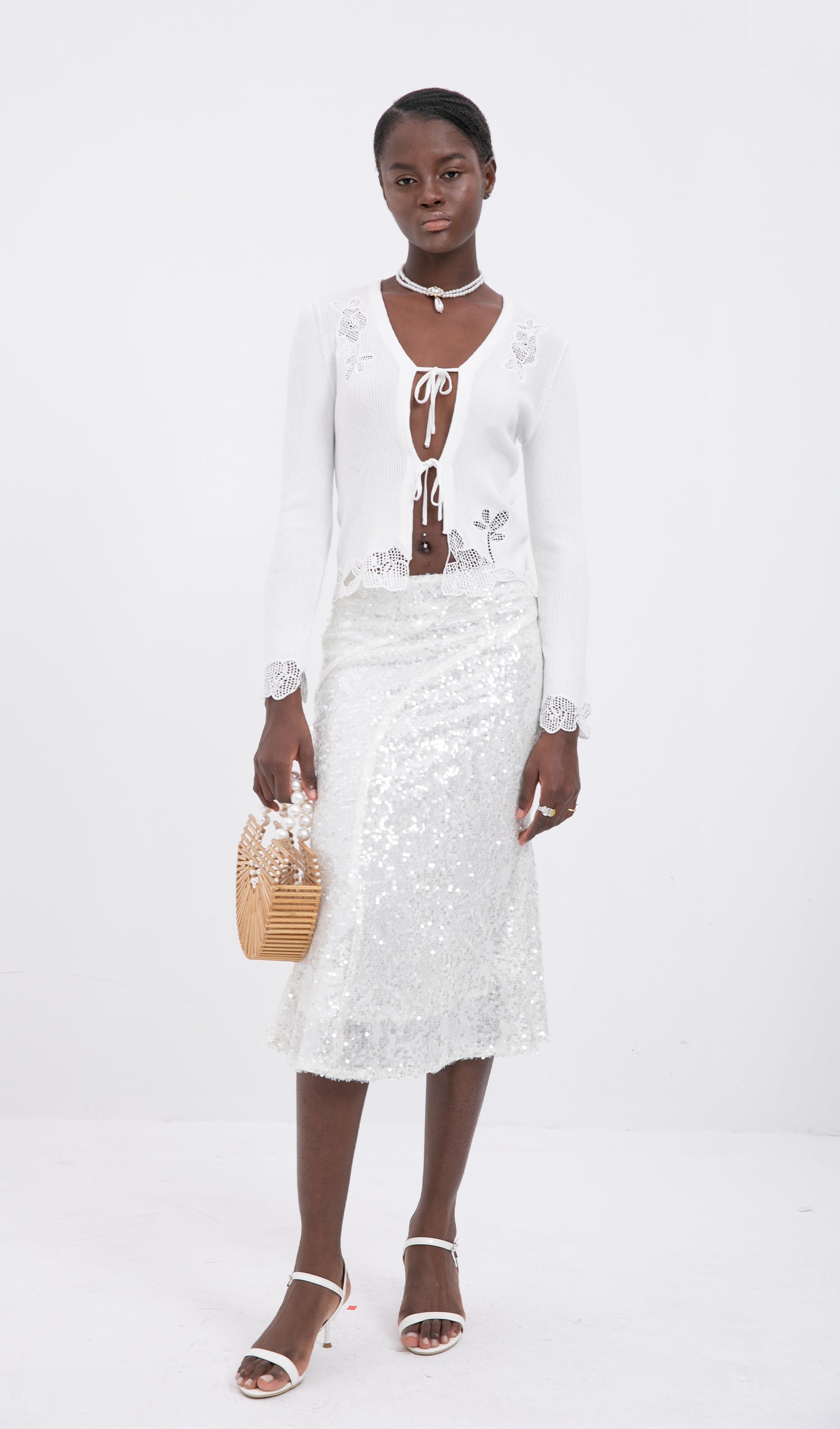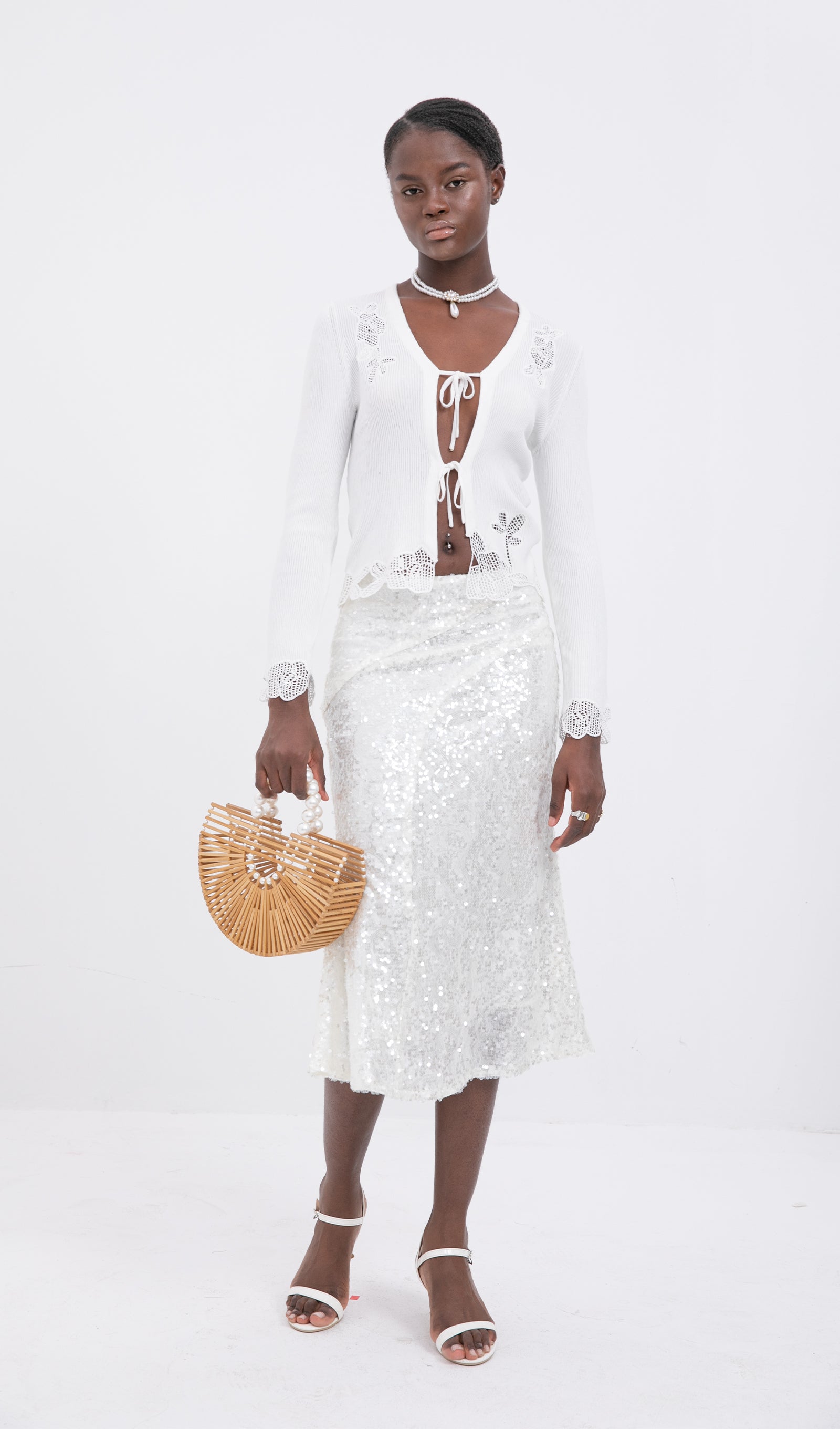 Derin V yakalı, fit uzun kollu ve bağcıklı hırka. Model yün karışımlı örme jarseden yapılmıştır ve beden, manşetler ve alt kenardaki ajur detaylarıyla tamamlanmıştır.
