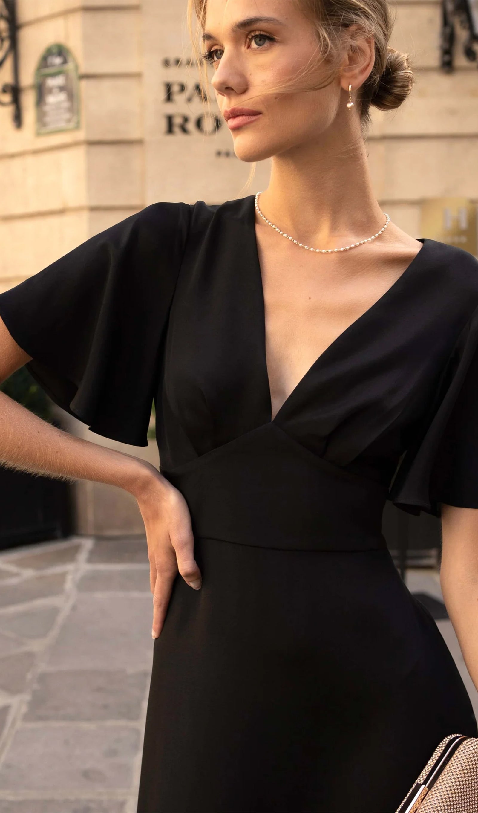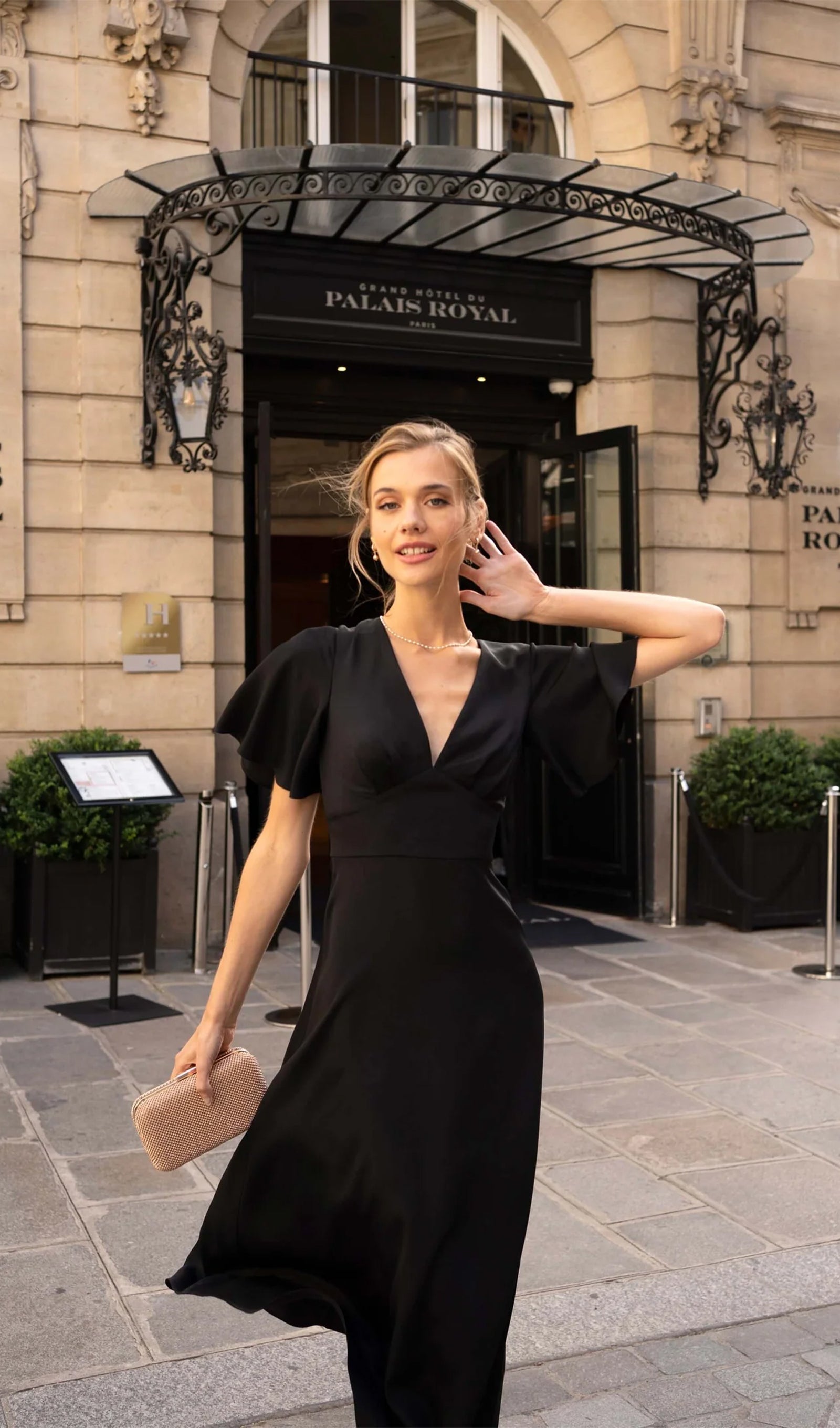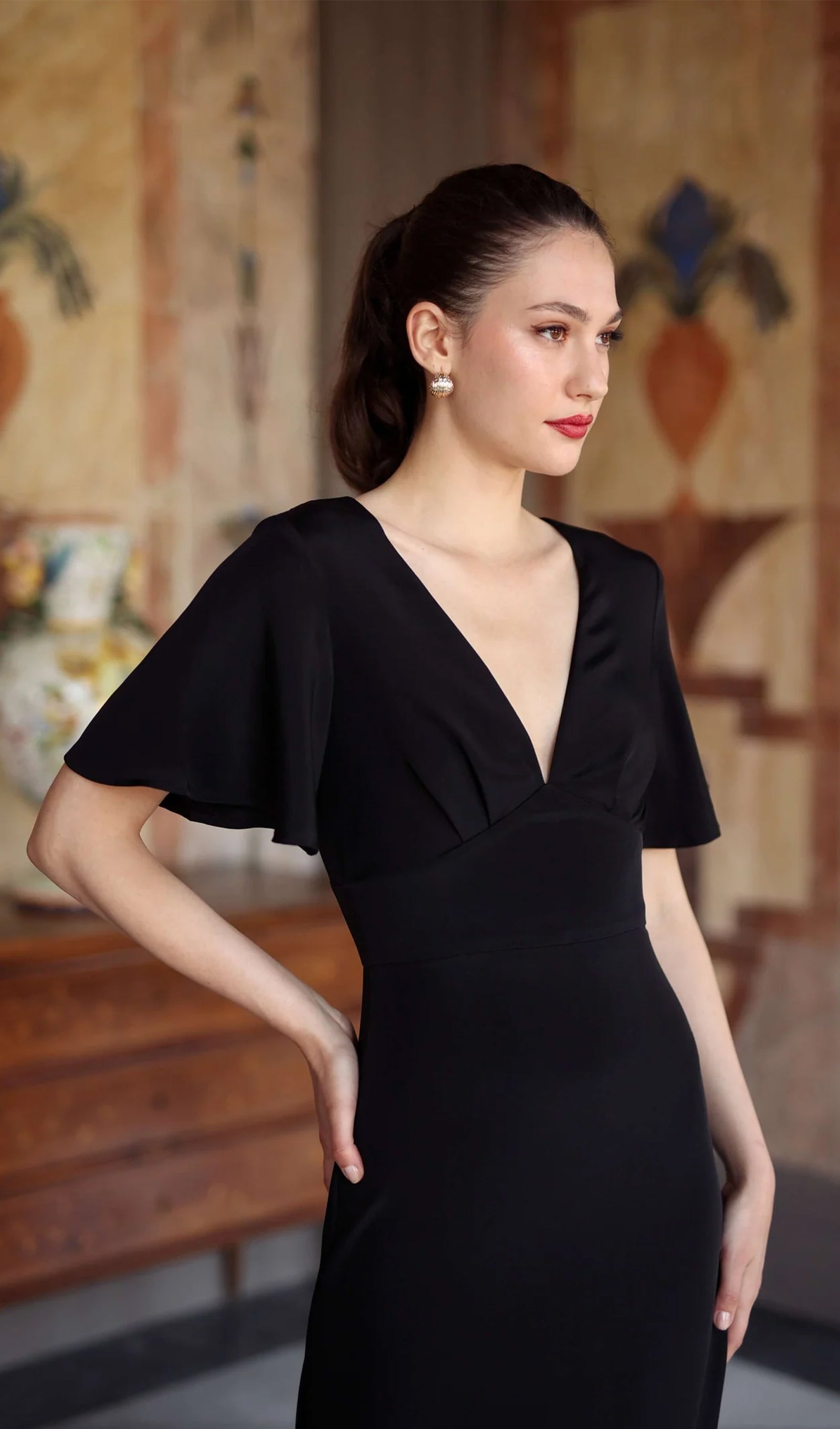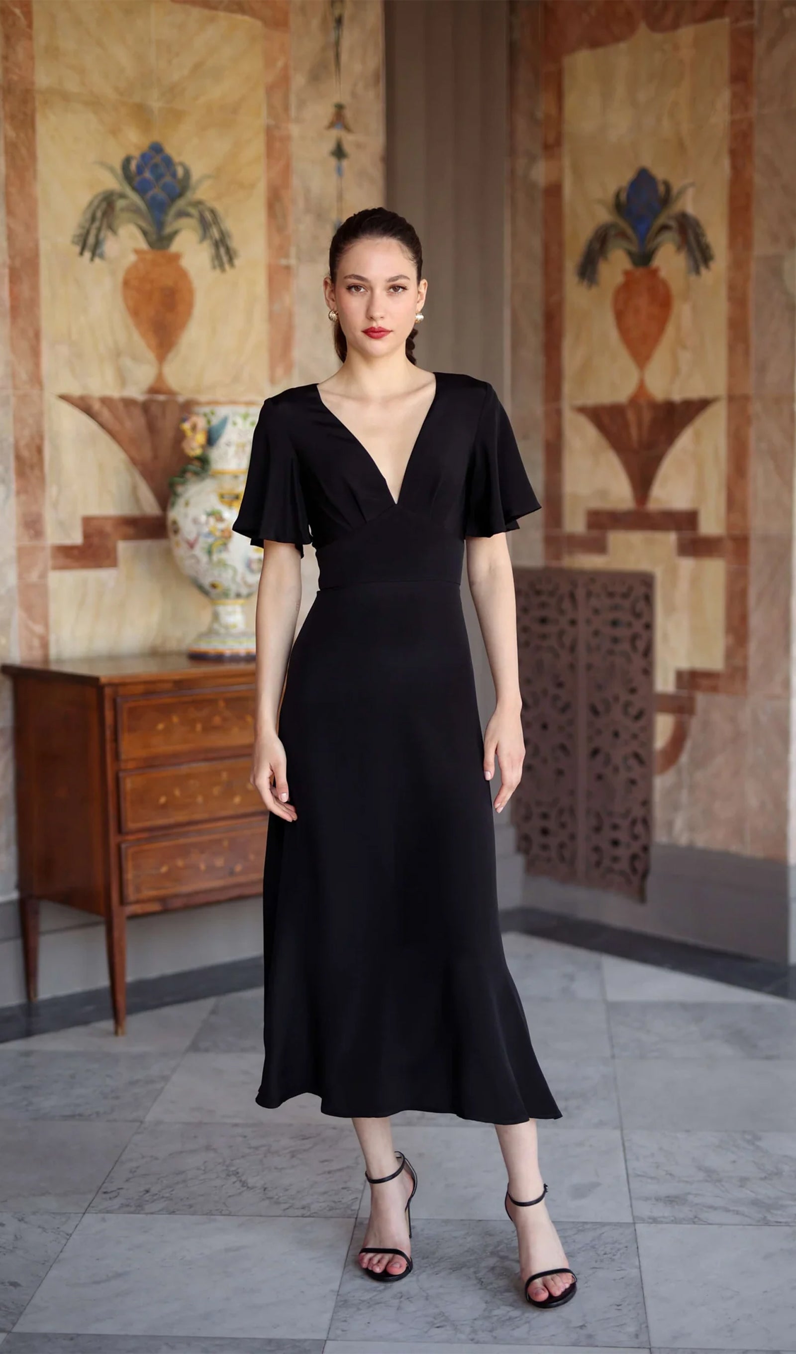 Lüks bir esnemeye sahip, geri dönüştürülmüş Çift Krep Ağır ipekten üretilen bu elbise, daldırmalı bir v yakayı ustaca çerçeveleyen narin flutter kollara sahipken, özel olarak tasarlanmış bir bel, yerini tam bir eteğe bırakıyor. Tasarım sırtı kapalı stildedir.