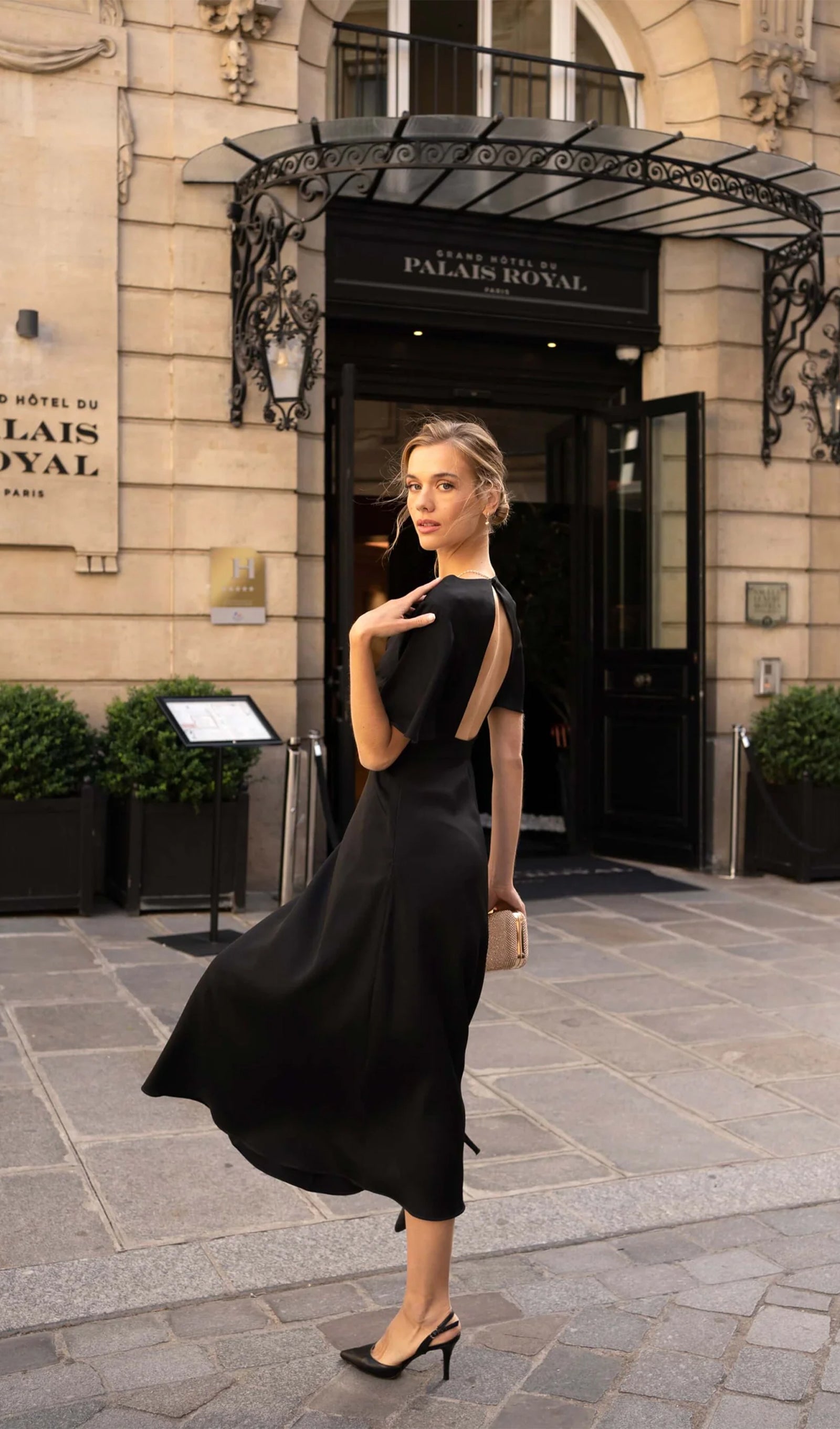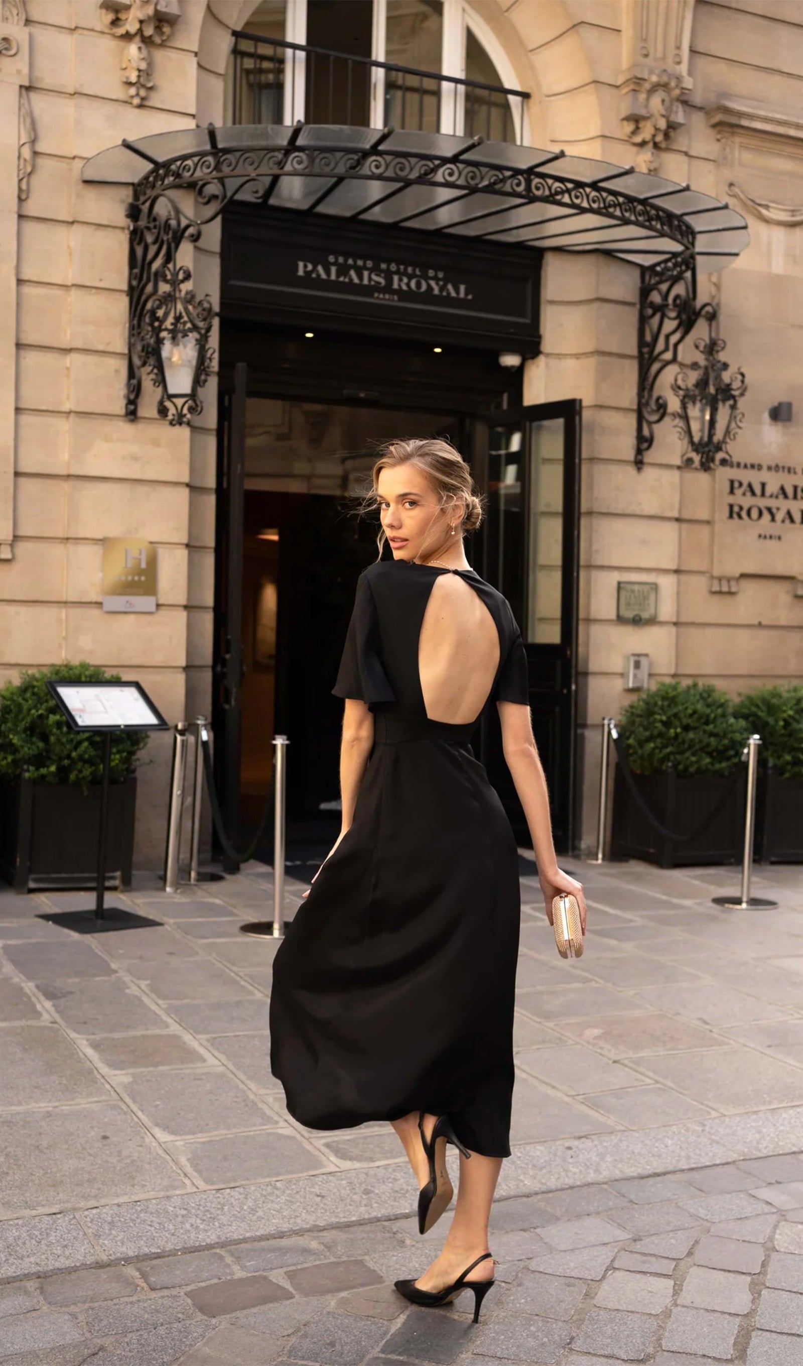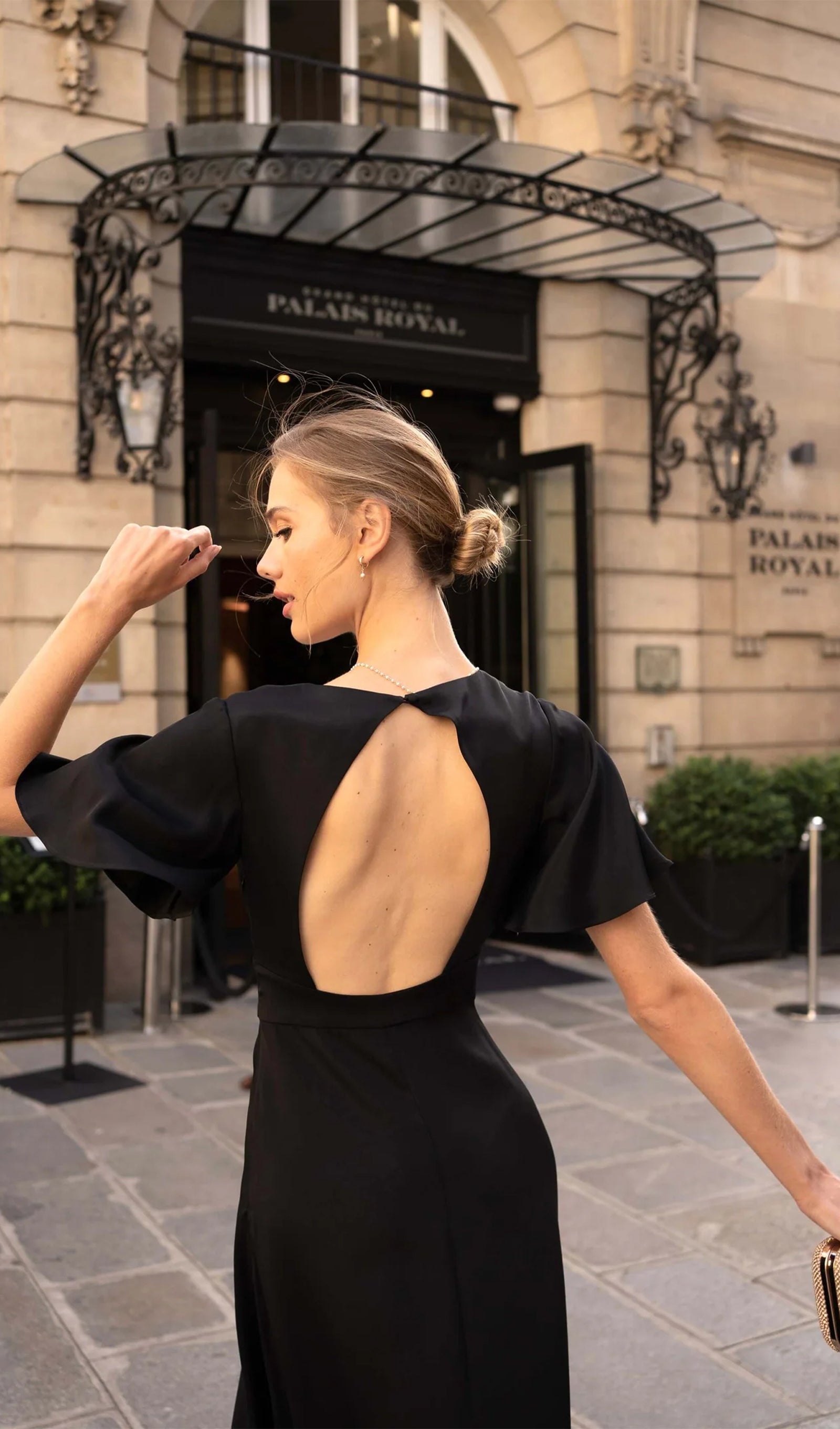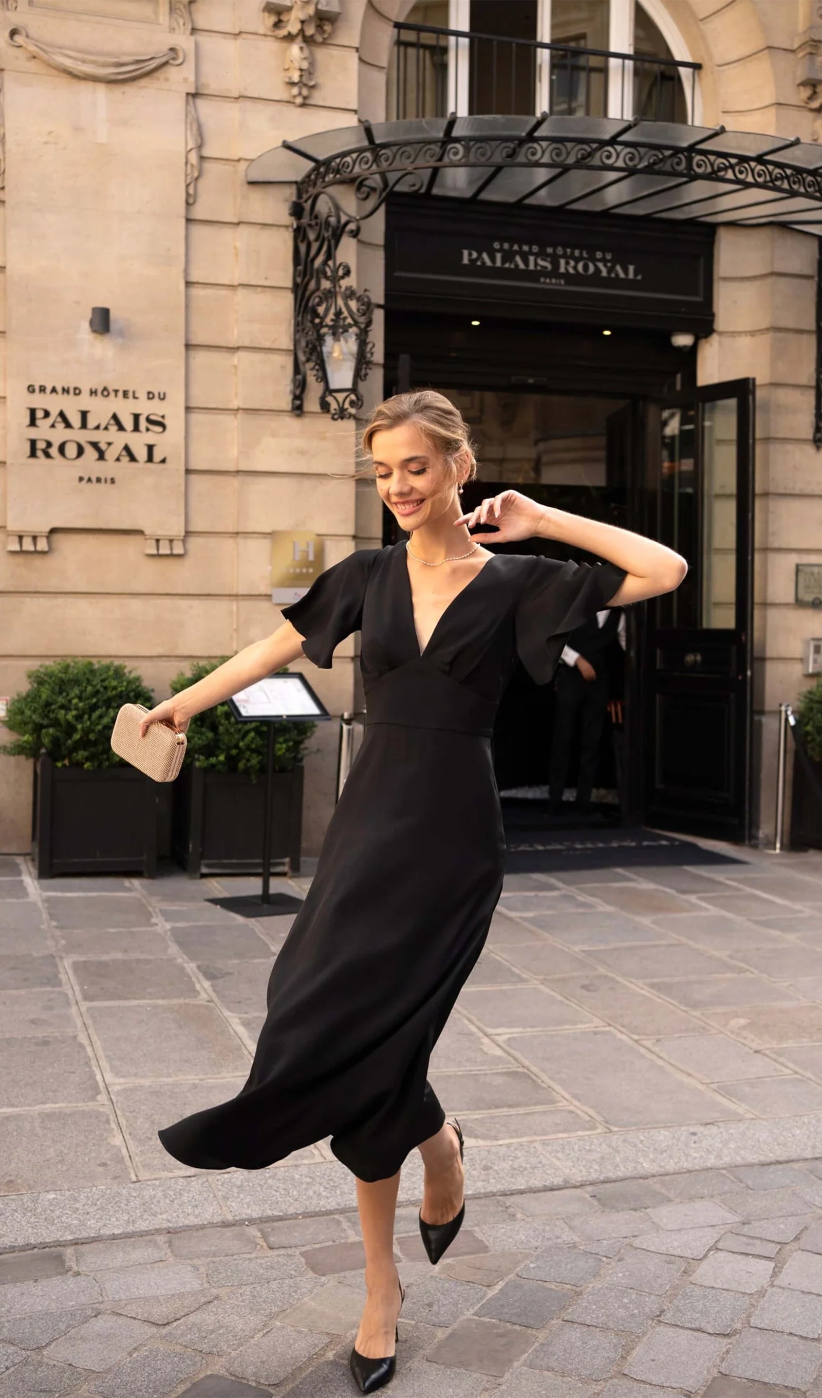 Lüks bir esnemeye sahip, geri dönüştürülmüş Çift Krep Ağır ipekten üretilen bu elbise, daldırmalı bir v yakayı ustaca çerçeveleyen narin flutter kollara sahipken, özel olarak tasarlanmış bir bel, yerini tam bir eteğe bırakıyor. Tasarım sırtı kapalı stildedir.