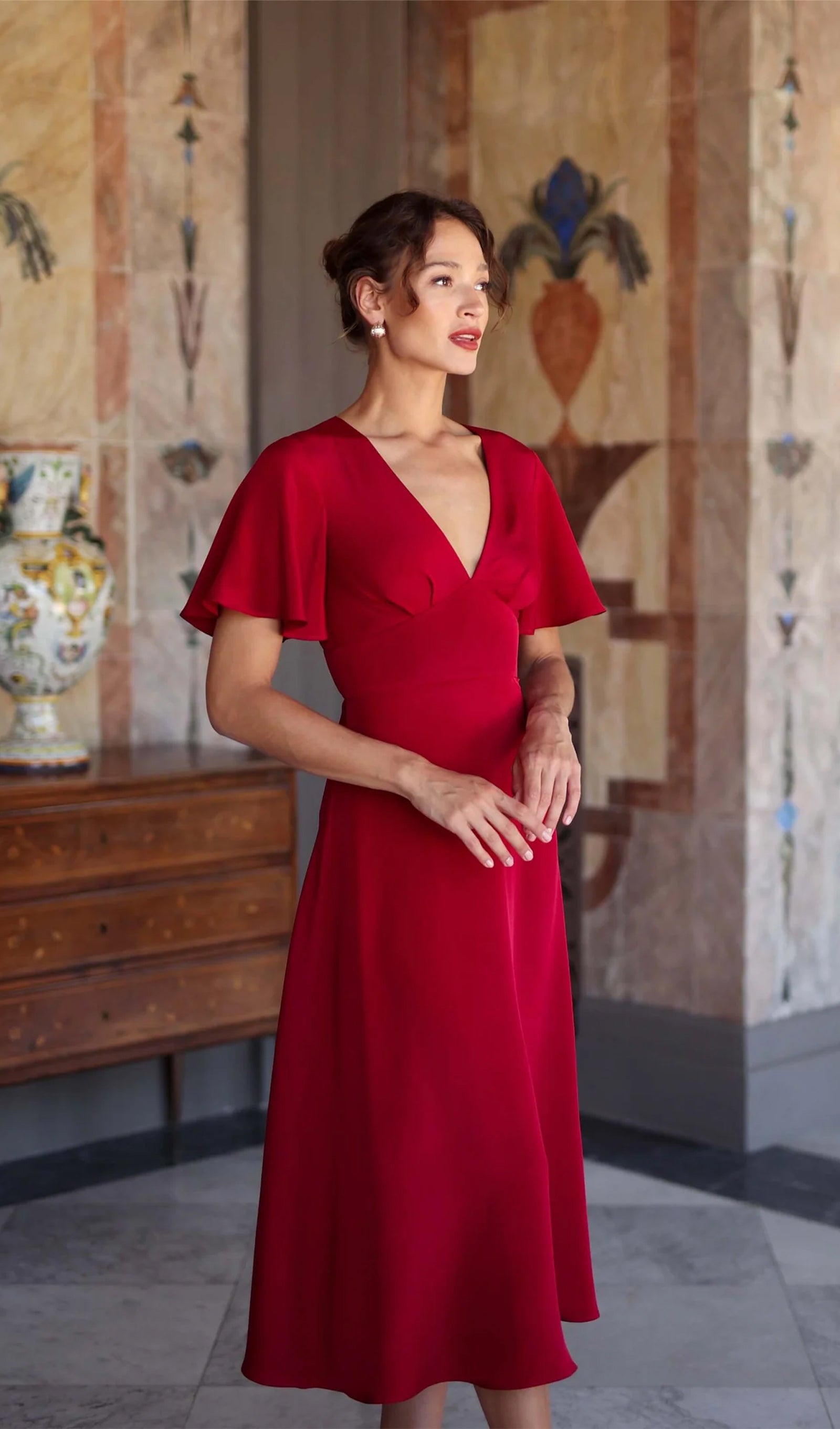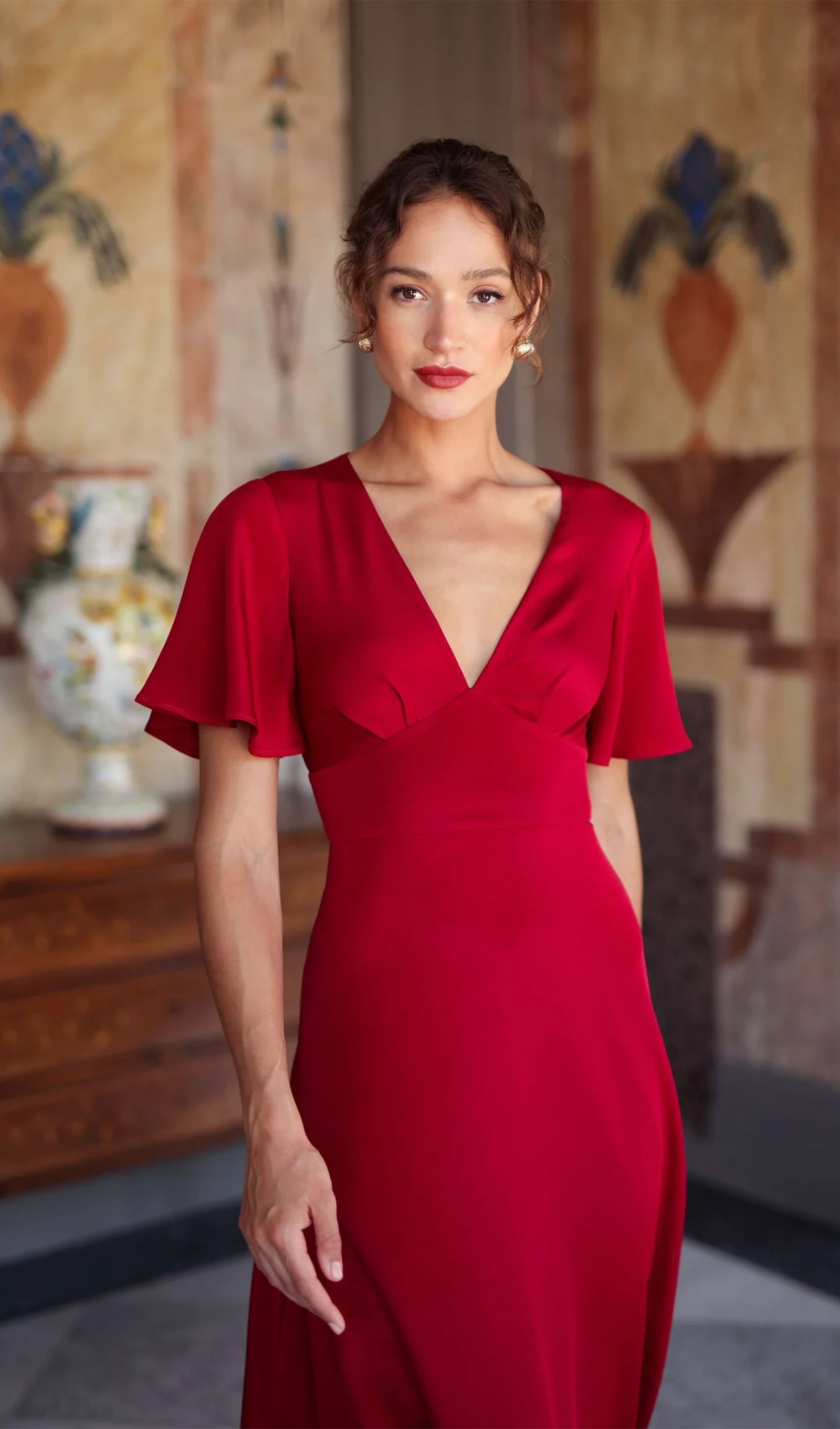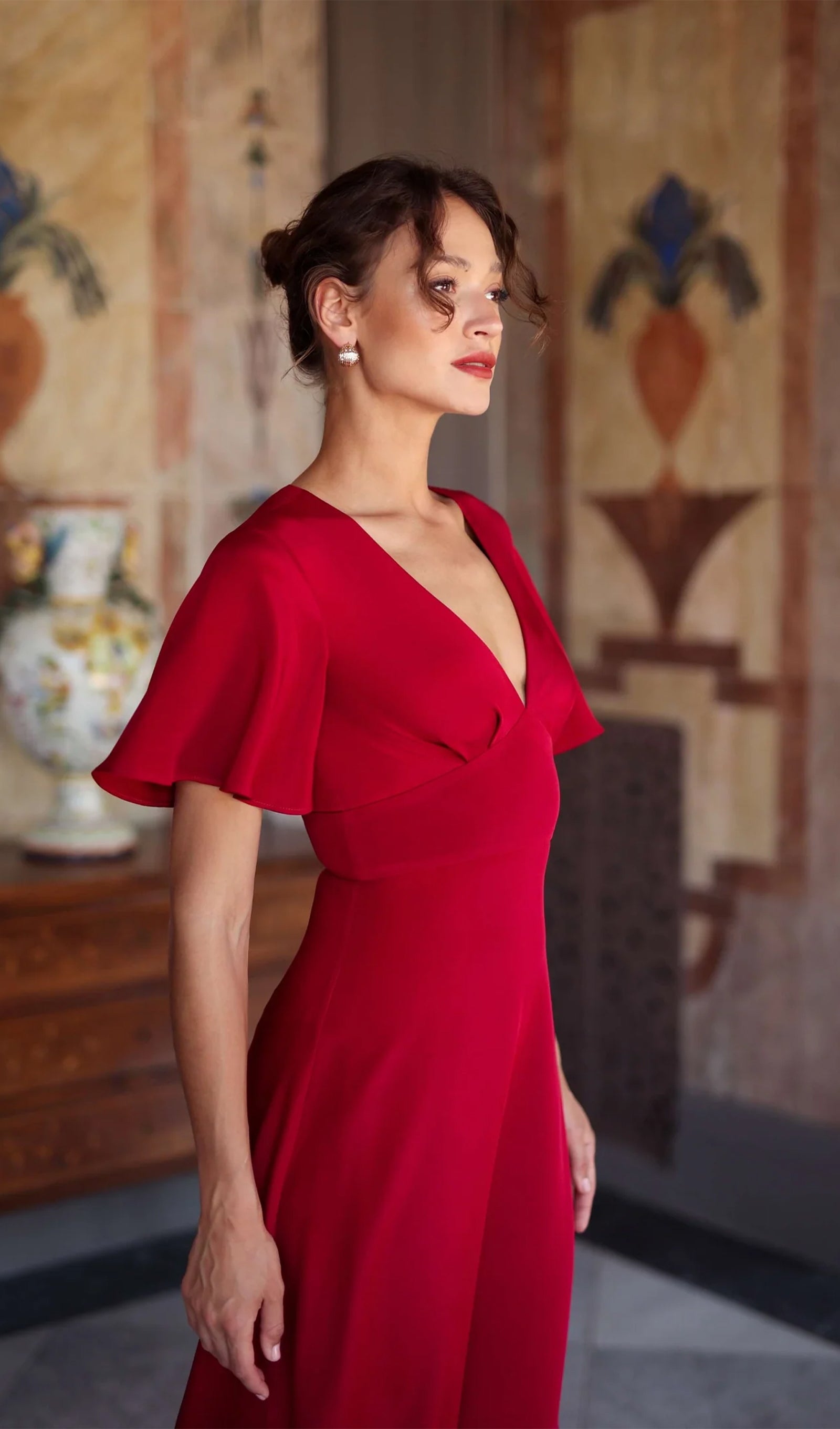 Lüks bir esnemeye sahip, geri dönüştürülmüş Çift Krep Ağır ipekten üretilen bu elbise, daldırmalı bir v yakayı ustaca çerçeveleyen narin flutter kollara sahipken, özel olarak tasarlanmış bir bel, yerini tam bir eteğe bırakıyor. Tasarım sırtı kapalı stildedir.