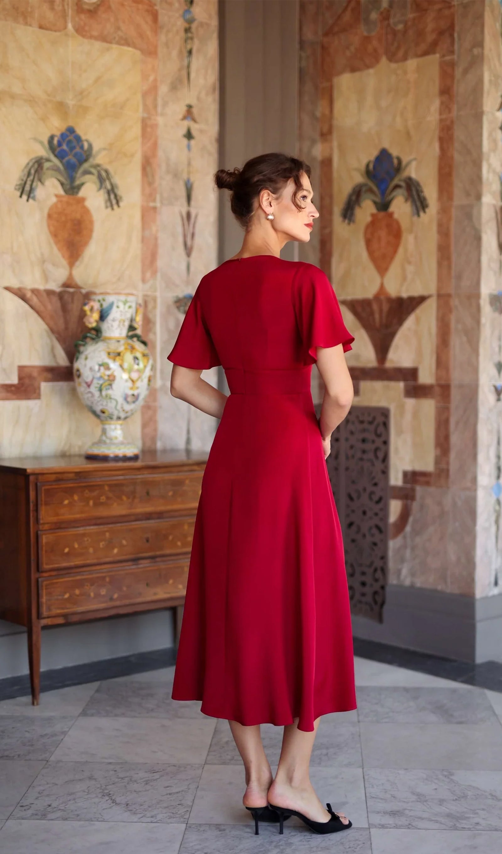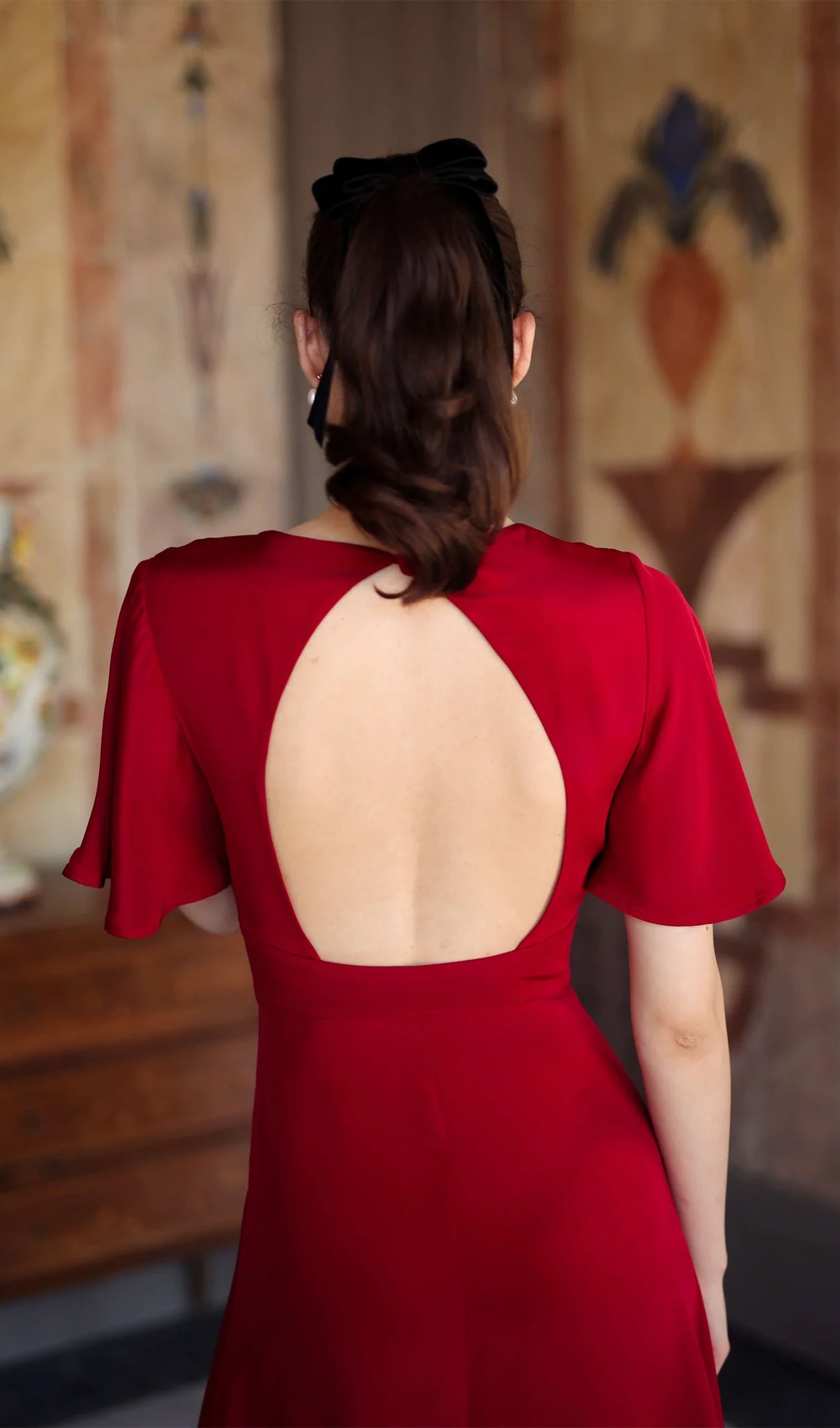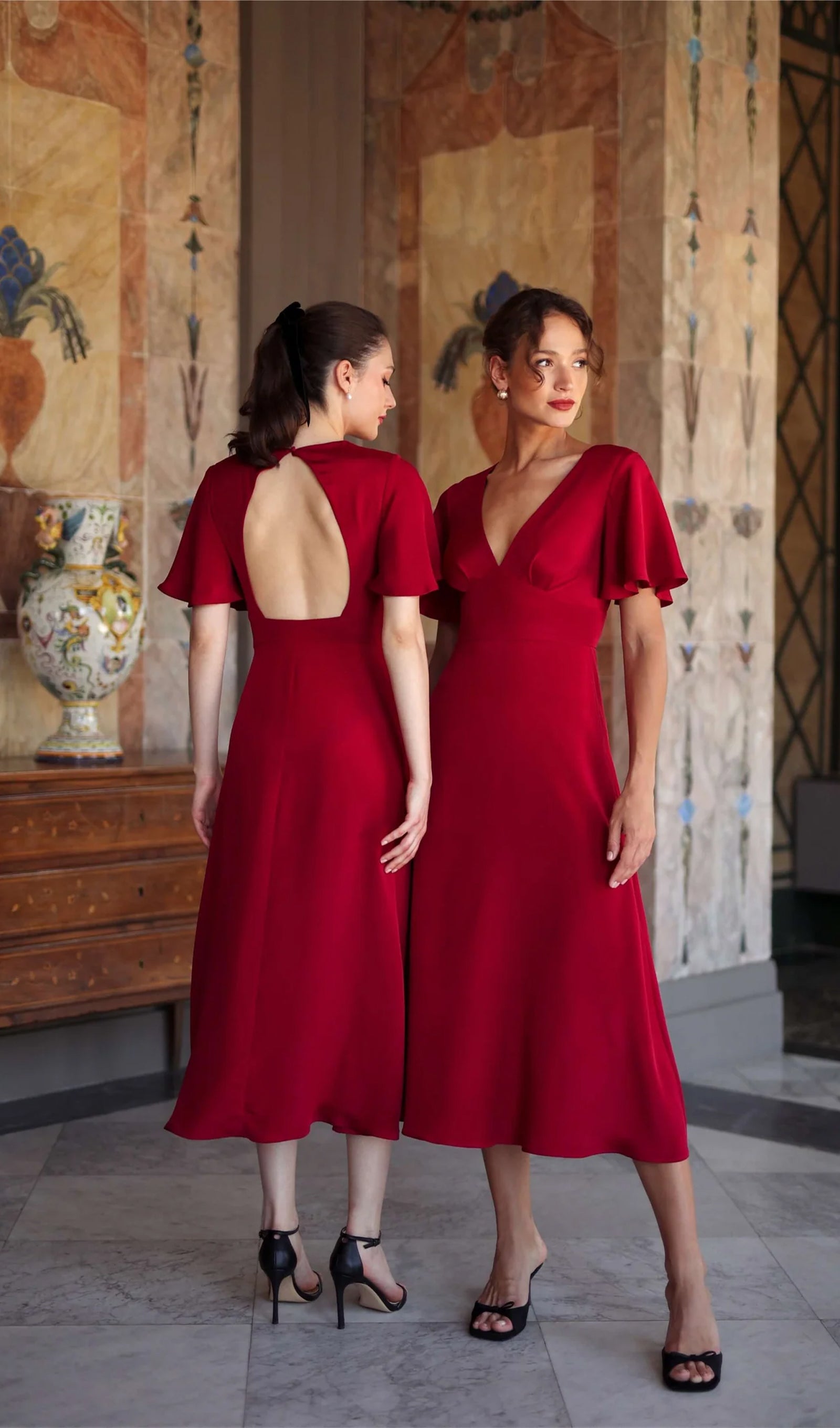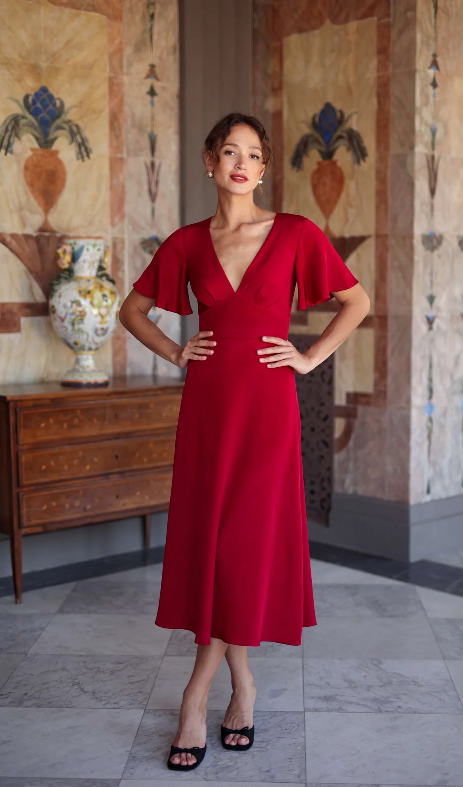 Lüks bir esnemeye sahip, geri dönüştürülmüş Çift Krep Ağır ipekten üretilen bu elbise, daldırmalı bir v yakayı ustaca çerçeveleyen narin flutter kollara sahipken, özel olarak tasarlanmış bir bel, yerini tam bir eteğe bırakıyor. Tasarım sırtı kapalı stildedir.