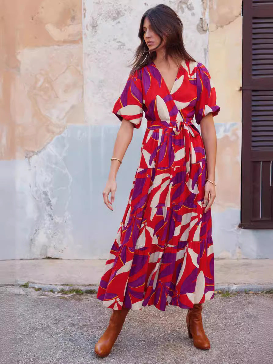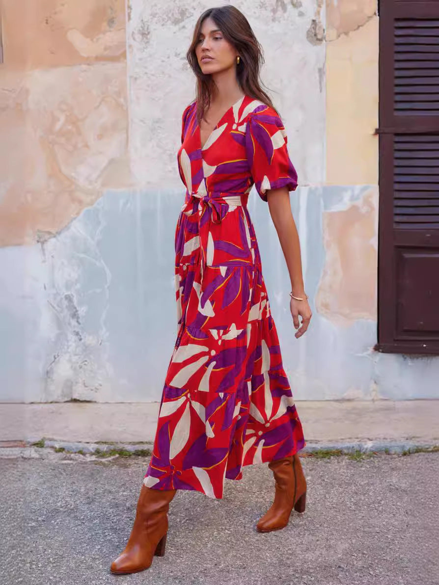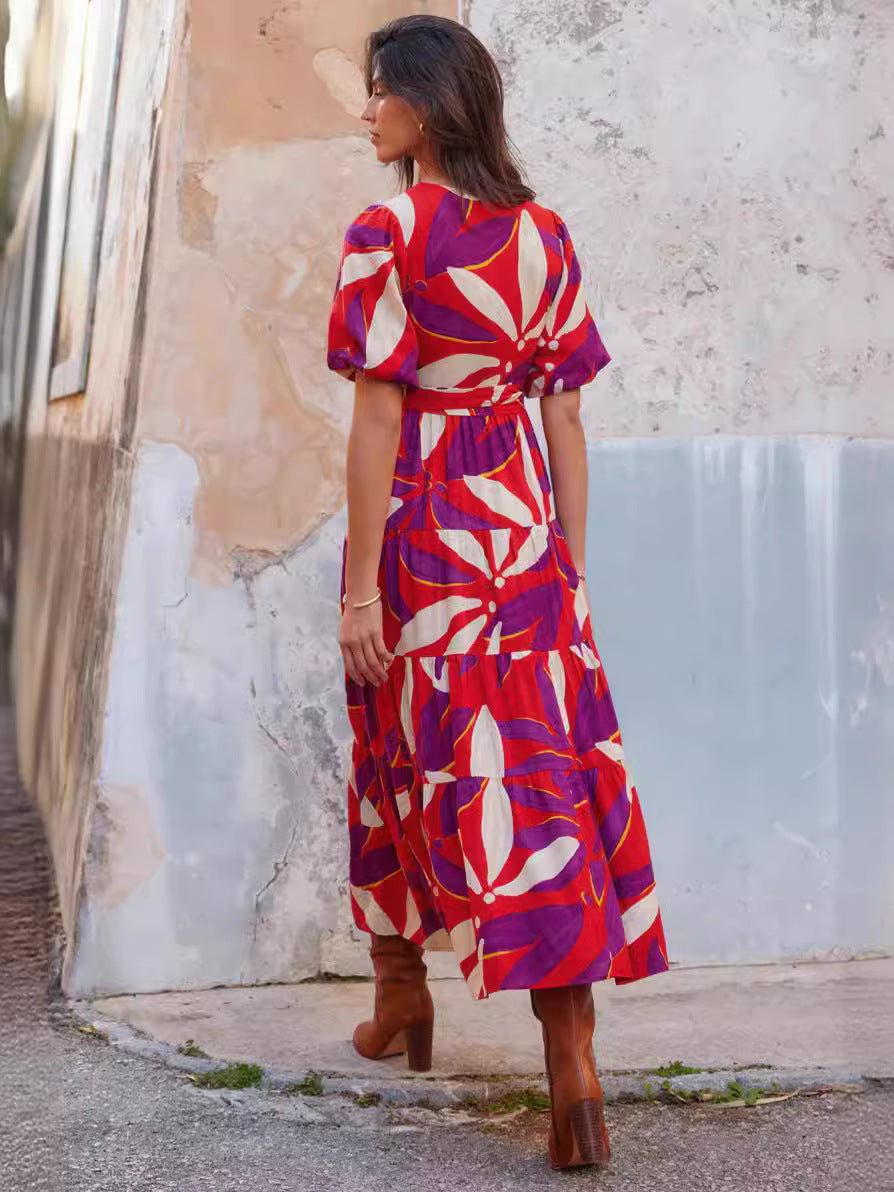 V Yaka Puf Kollu Yırtmaç Baskılı Maksi Elbise
