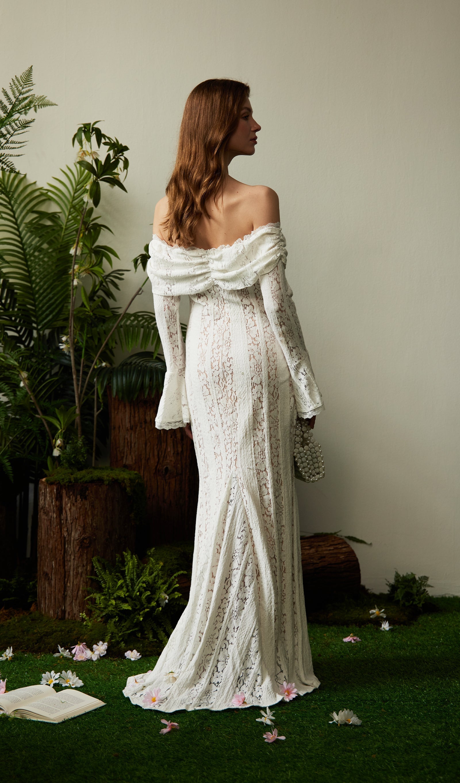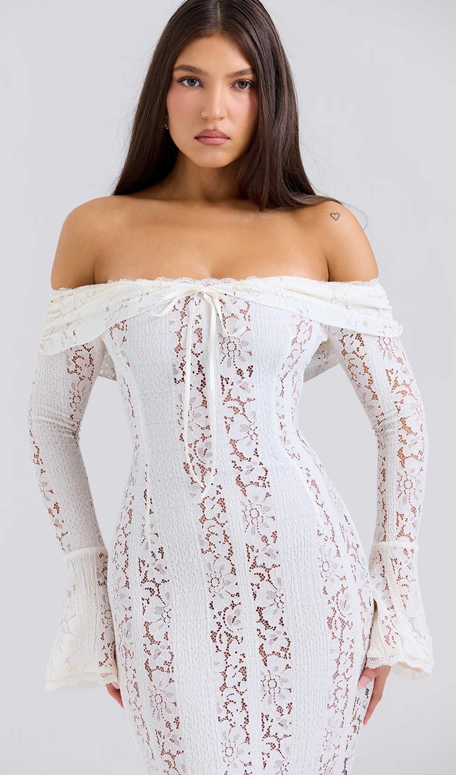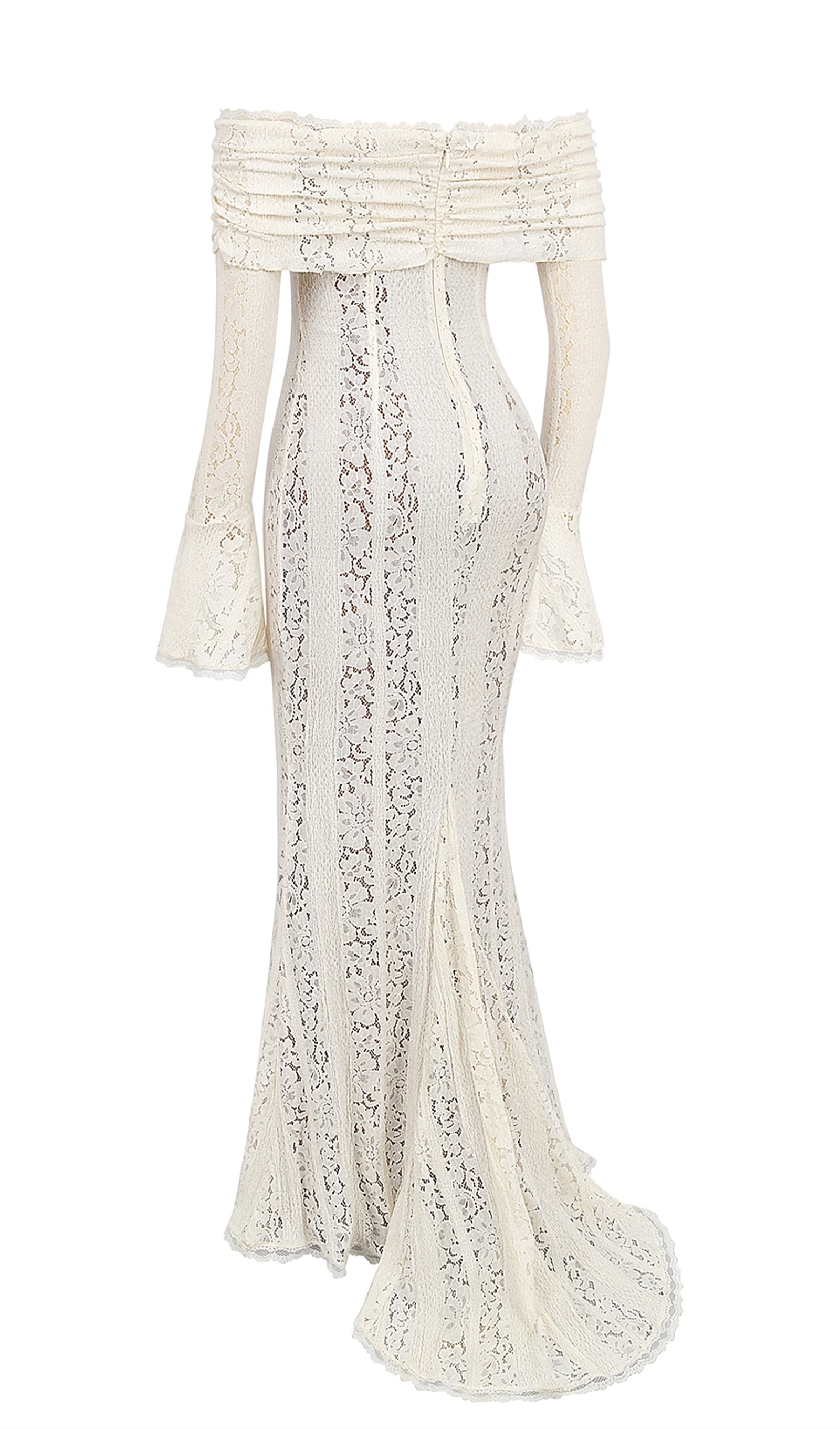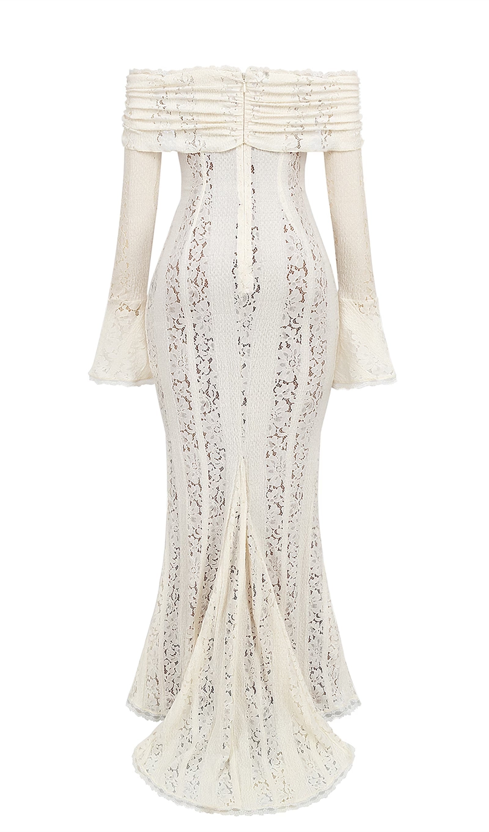 Vintage Çiçekli Dantel Kapalı Omuz Maksi Elbise