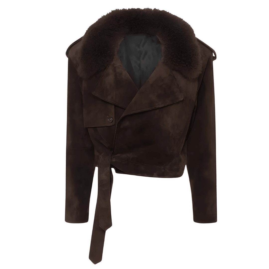 Zengin kahverengi renkteki bu şık kırpılmış süet ceket ile kış gardırobunuzu yükseltin. Daha fazla sıcaklık ve şıklık için lüks bir suni kürk yakaya sahip olan ceket, tek düğmeli çift düğmeli bir ön kısım sergiliyor. Ayarlanabilir bel kemeri özel bir dokunuş katarken, yapılandırılmış omuzlar cesur, modern bir siluet sağlar. Günlük gezintiler veya şık gece kıyafetleriyle eşleştirmek için mükemmel olan bu ceket, konforu zamansız modayla birleştiriyor.