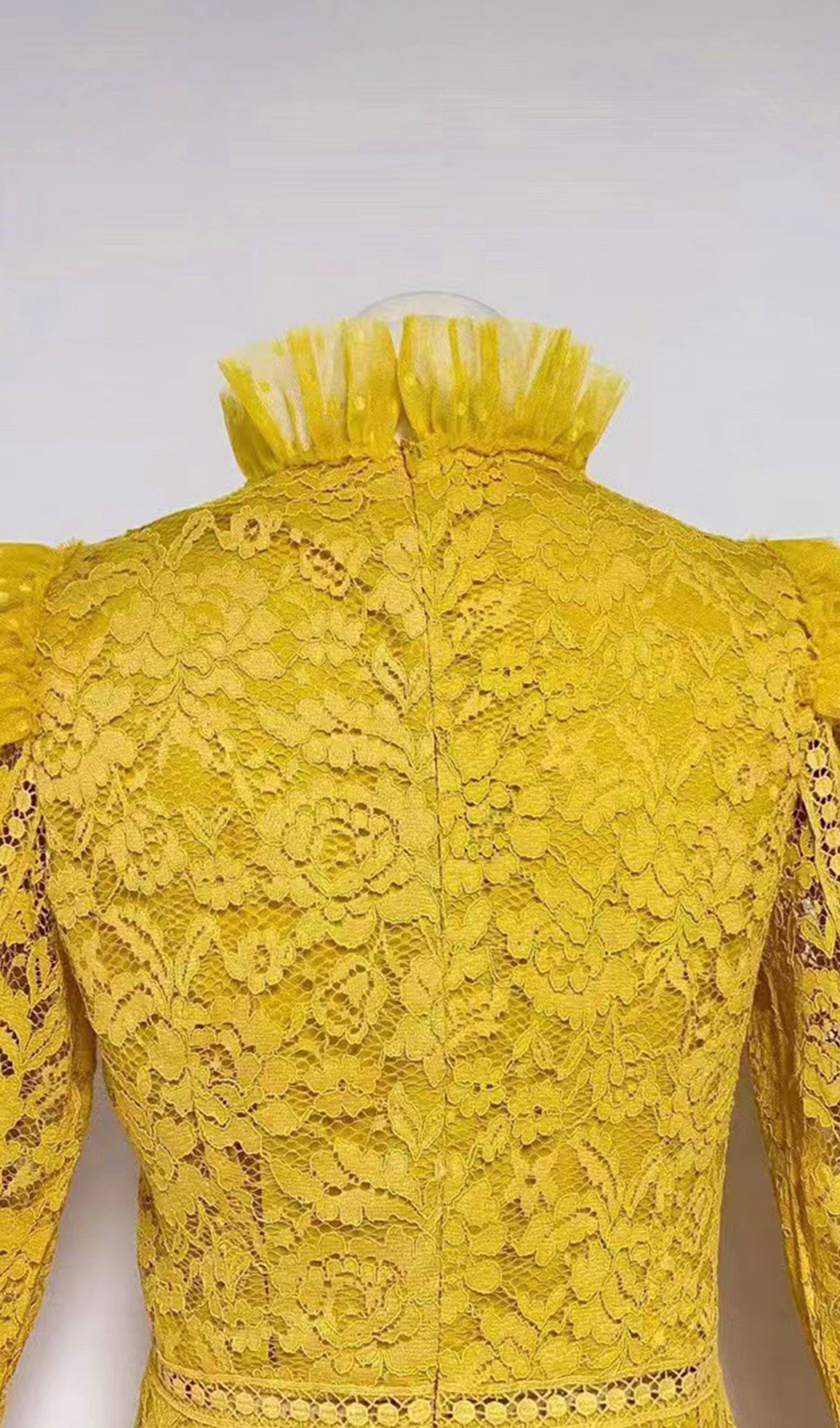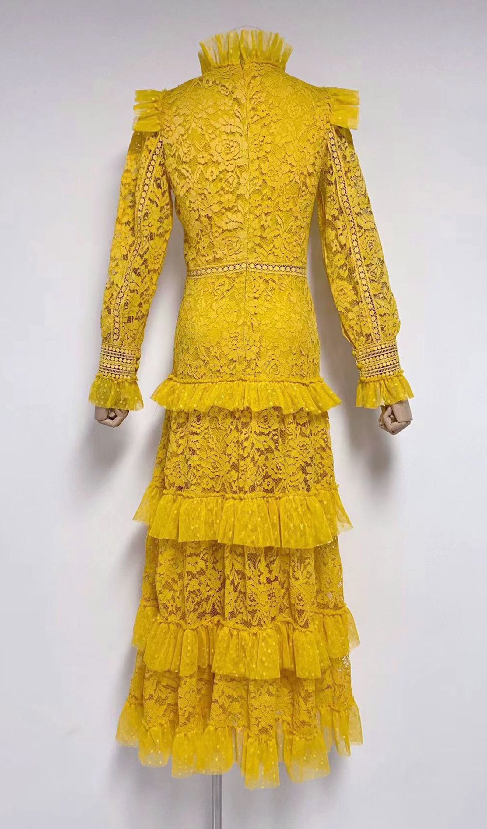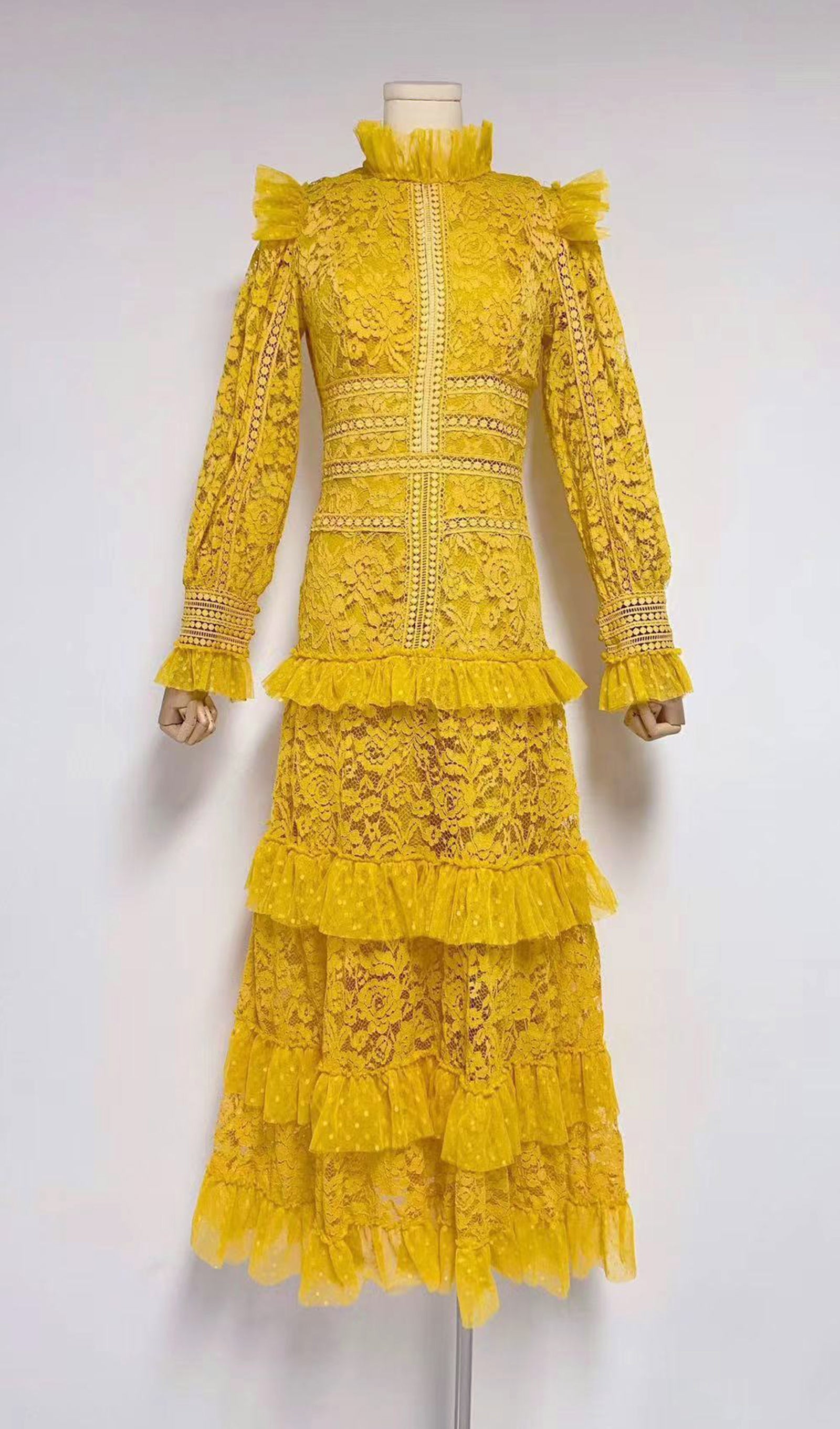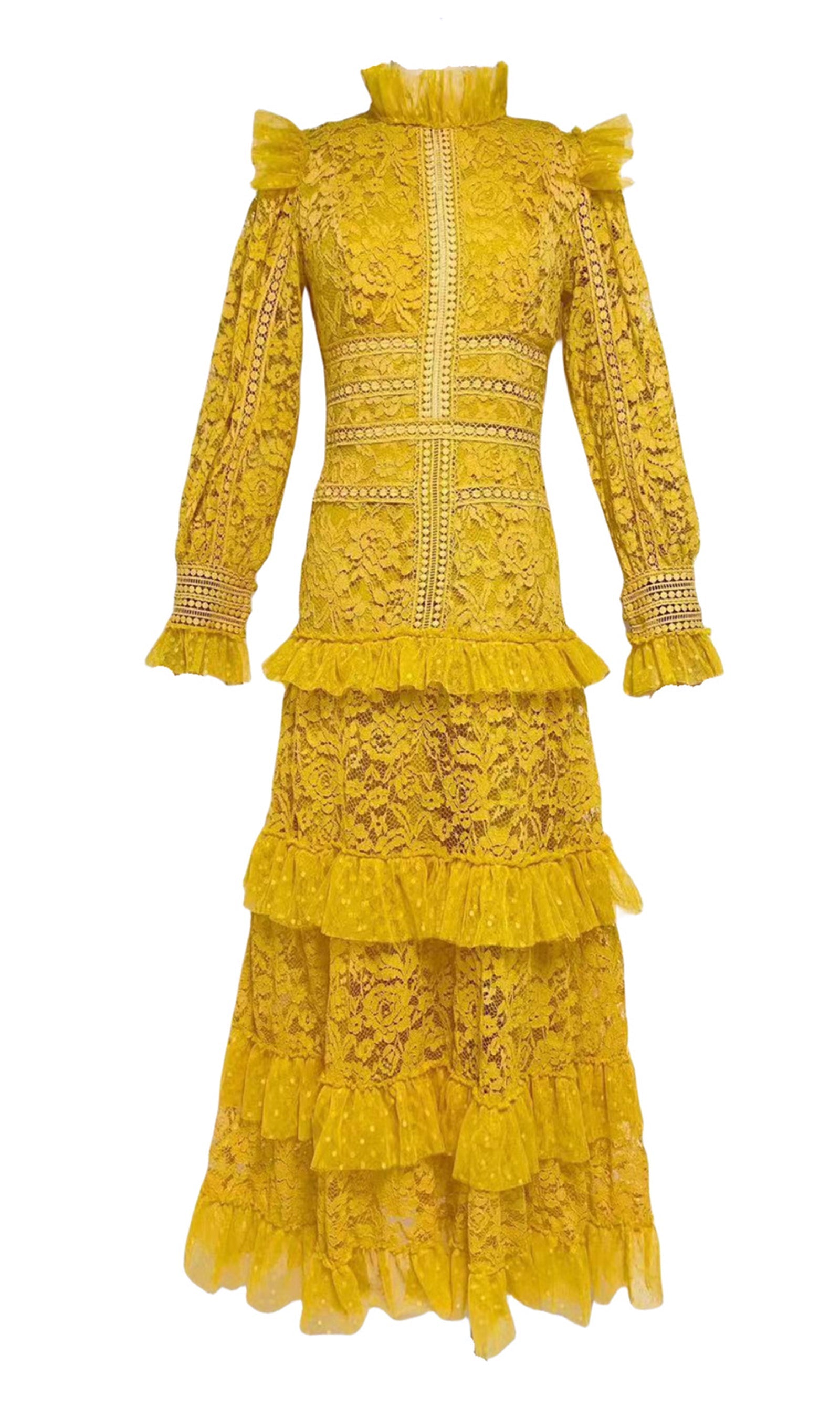 Vintage Uzun Kollu Fırfırlı Dantel Maksi Elbise Sarı