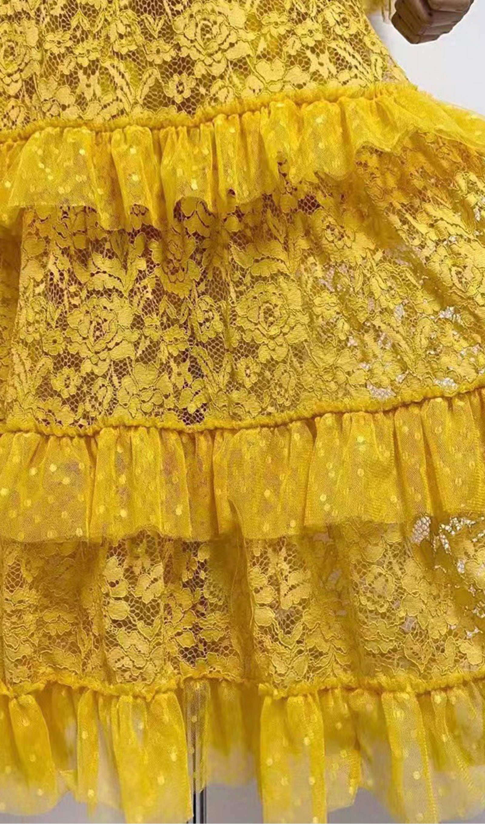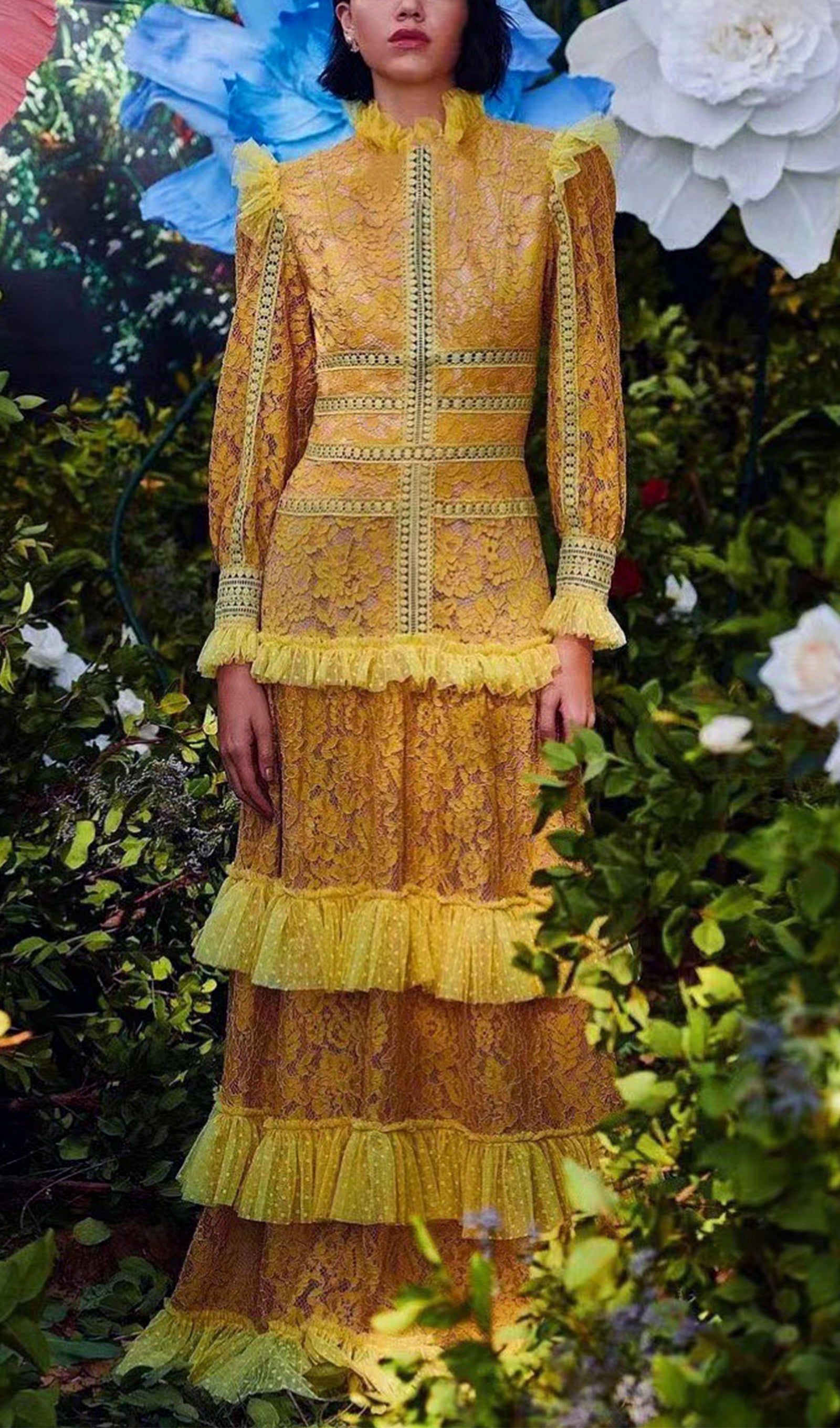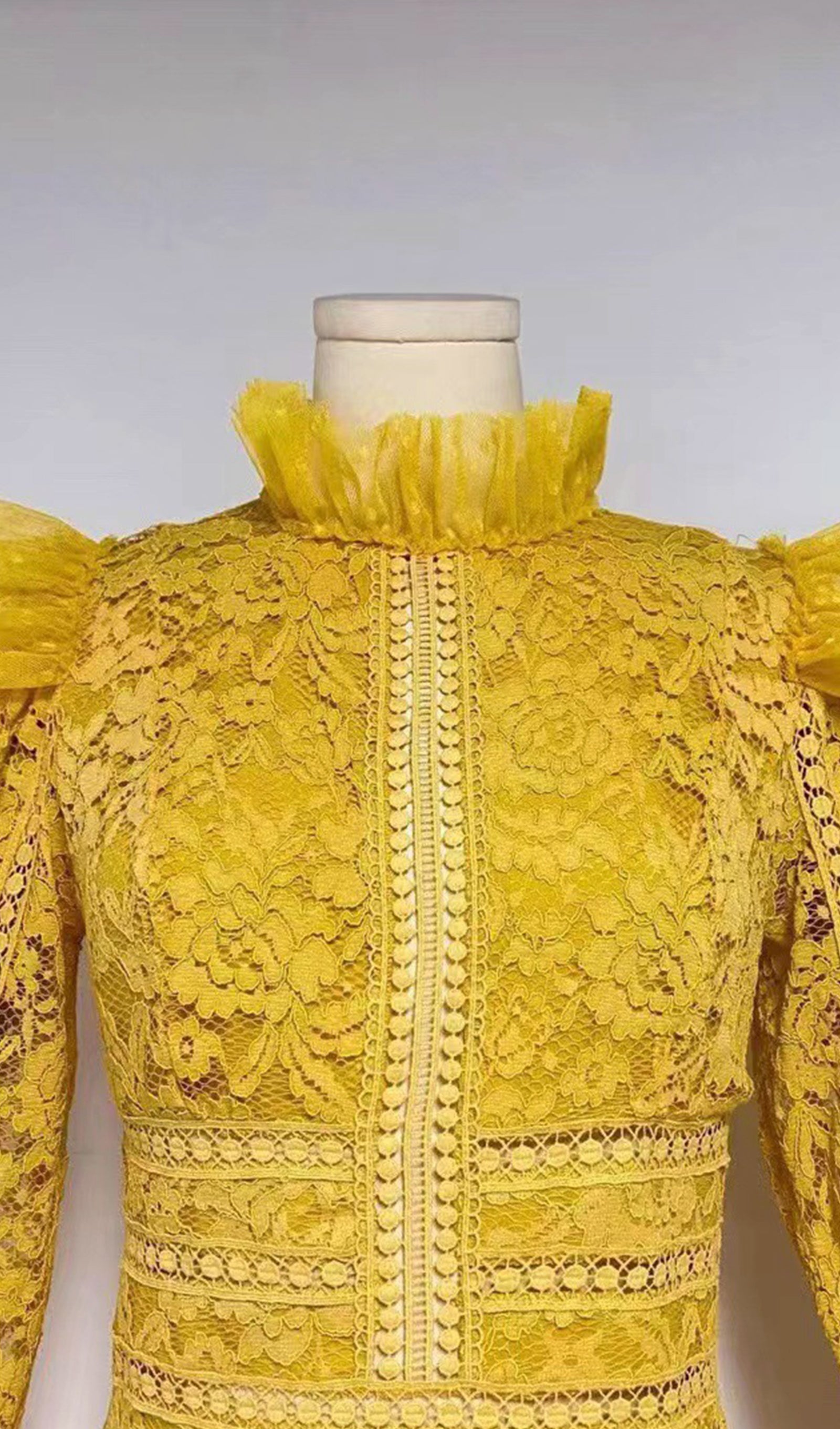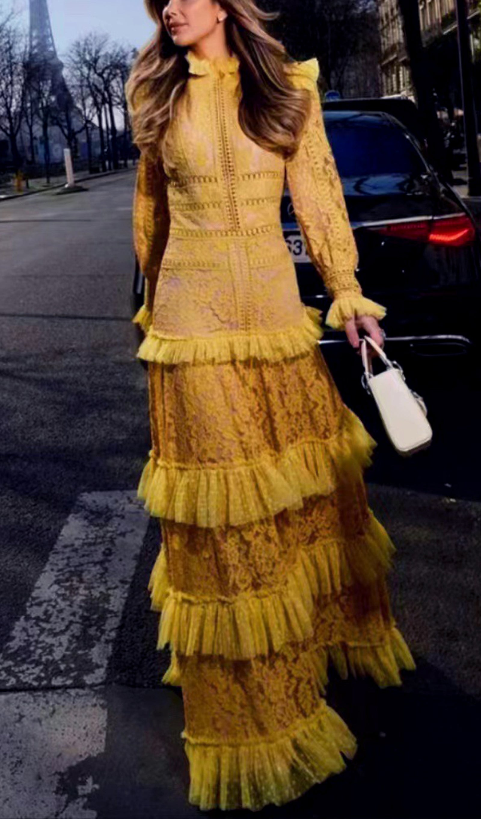 Vintage Uzun Kollu Fırfırlı Dantel Maksi Elbise Sarı