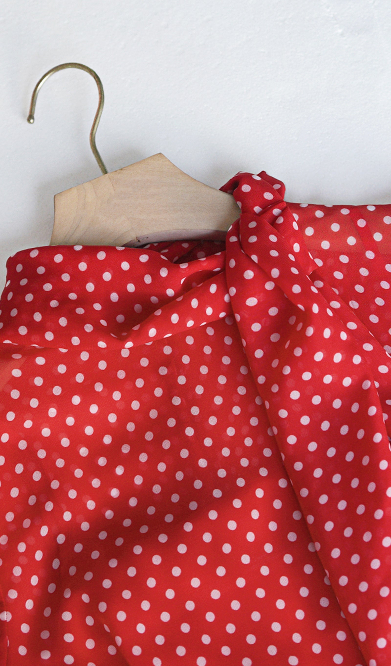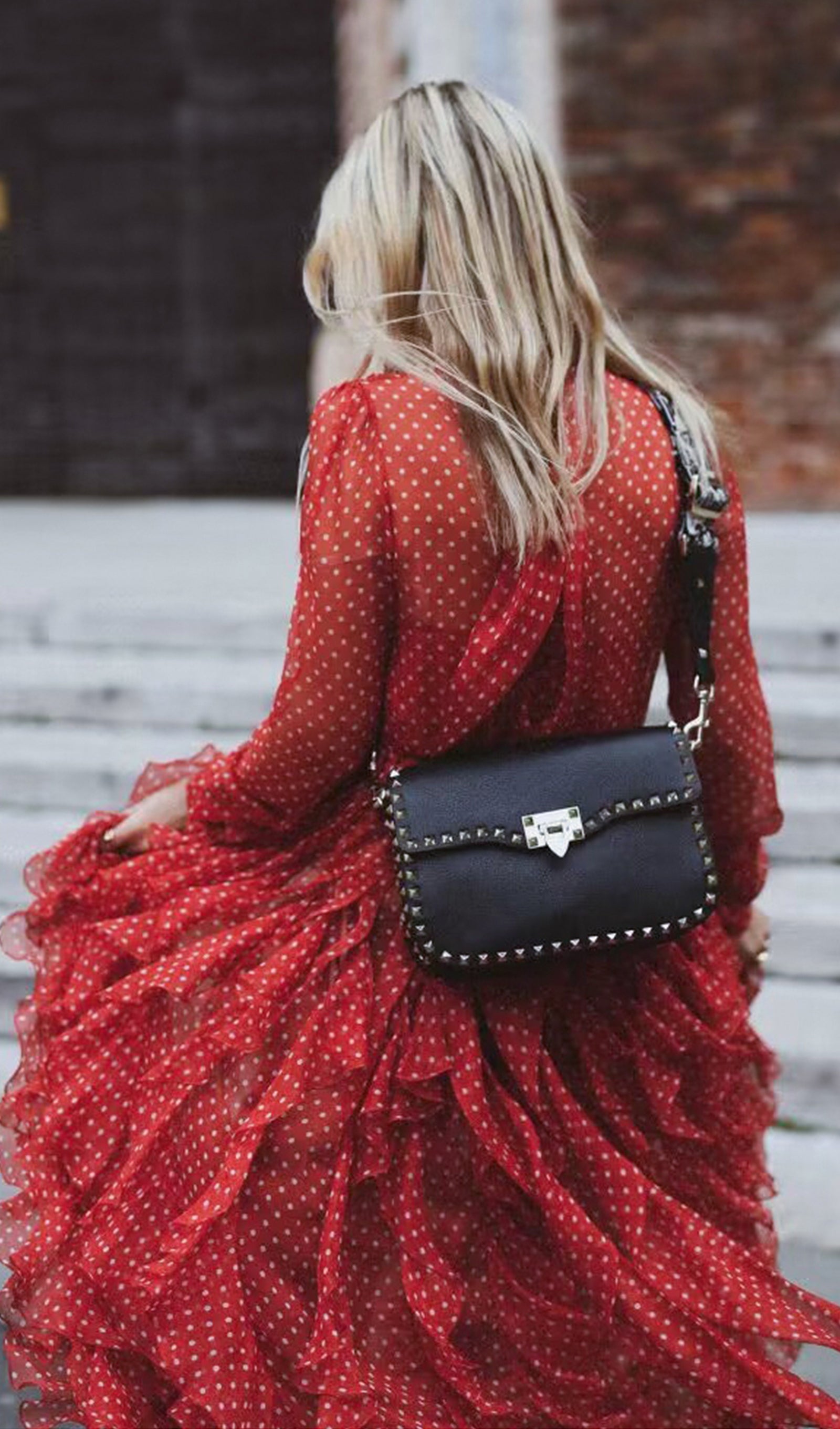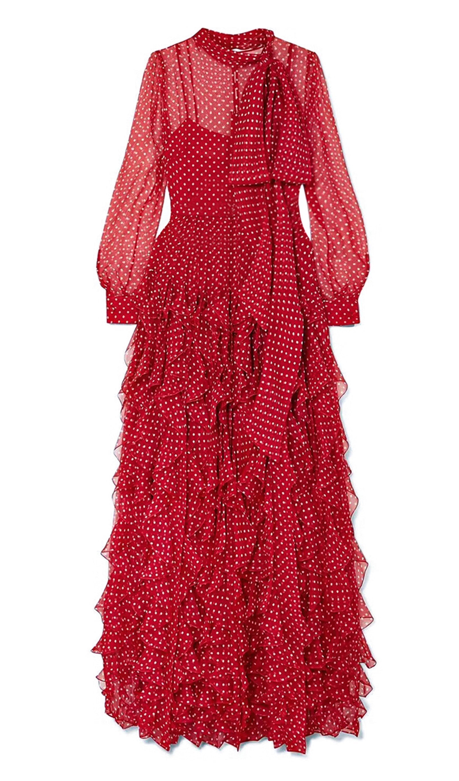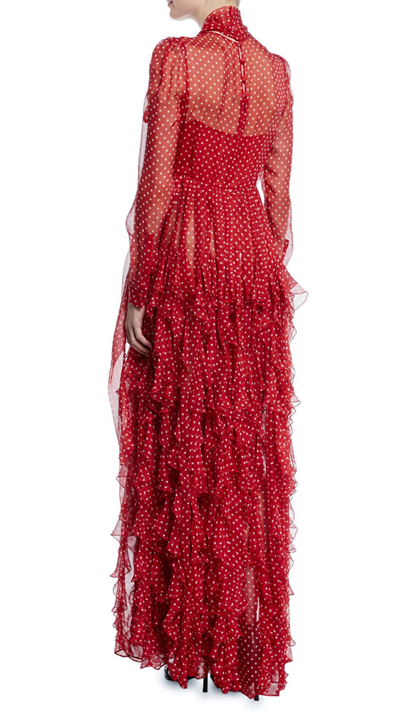 Vintage Görünümlü Puantiyeli Fırfırlı Maksi Elbise Kırmızı