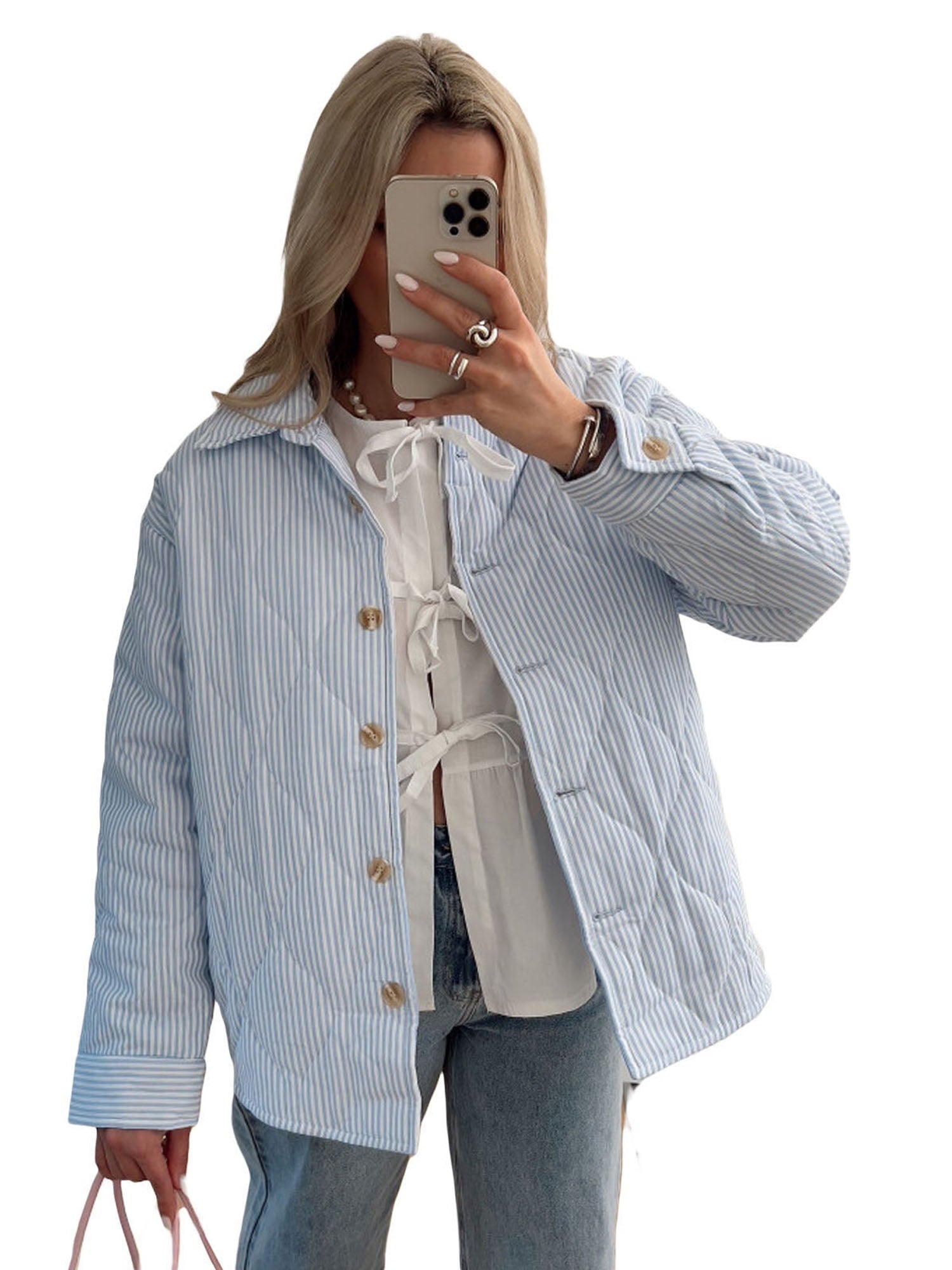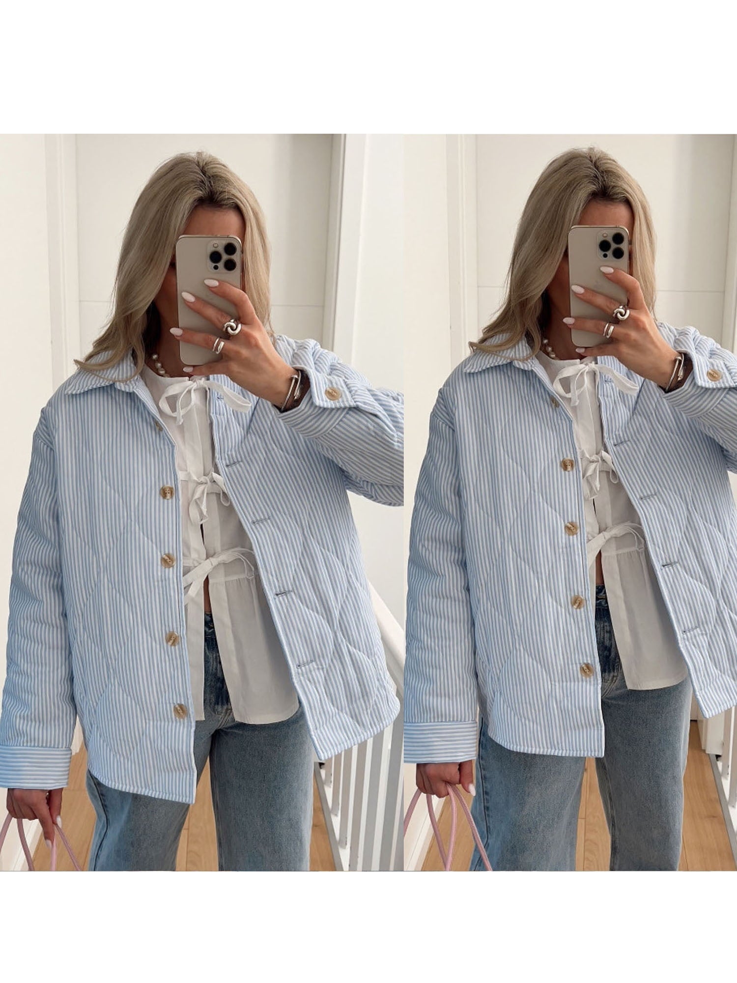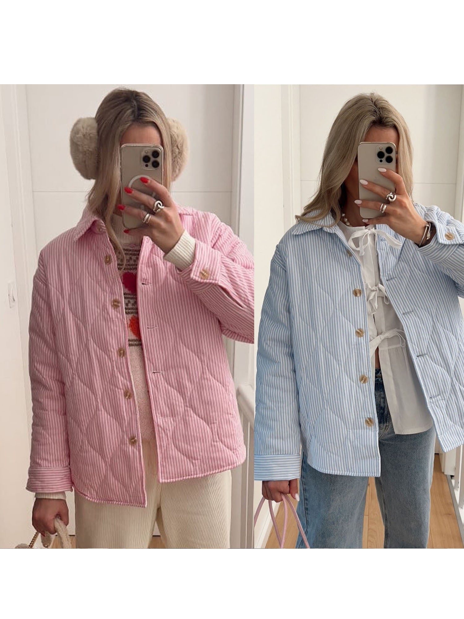 - Tasarım: Çizgili kadın mont ve ceketleri, lüks ve şık bir görünüme sahip, şekillendirilmesi kolay, düğmeli, uzun kollu, yakası aşağı doğru kıvrık, soğuk gecelerde veya rüzgarlı günlerde bile sıcak kalır.