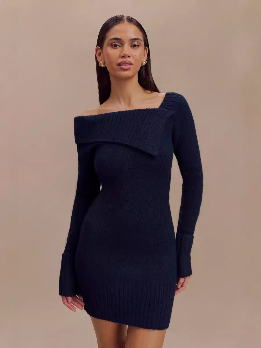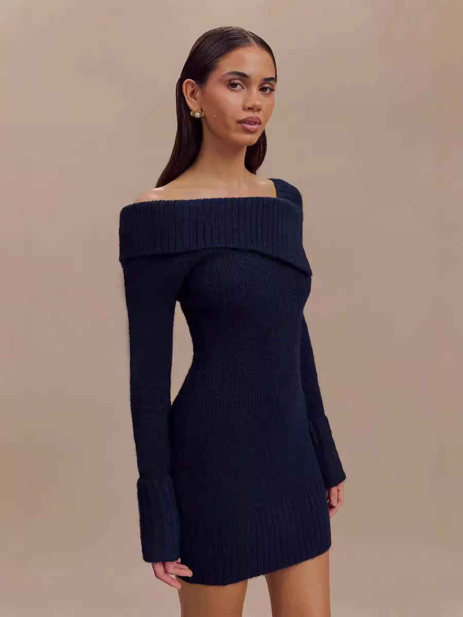 Düşük Yaka Örme Mini Elbise Kemersiz