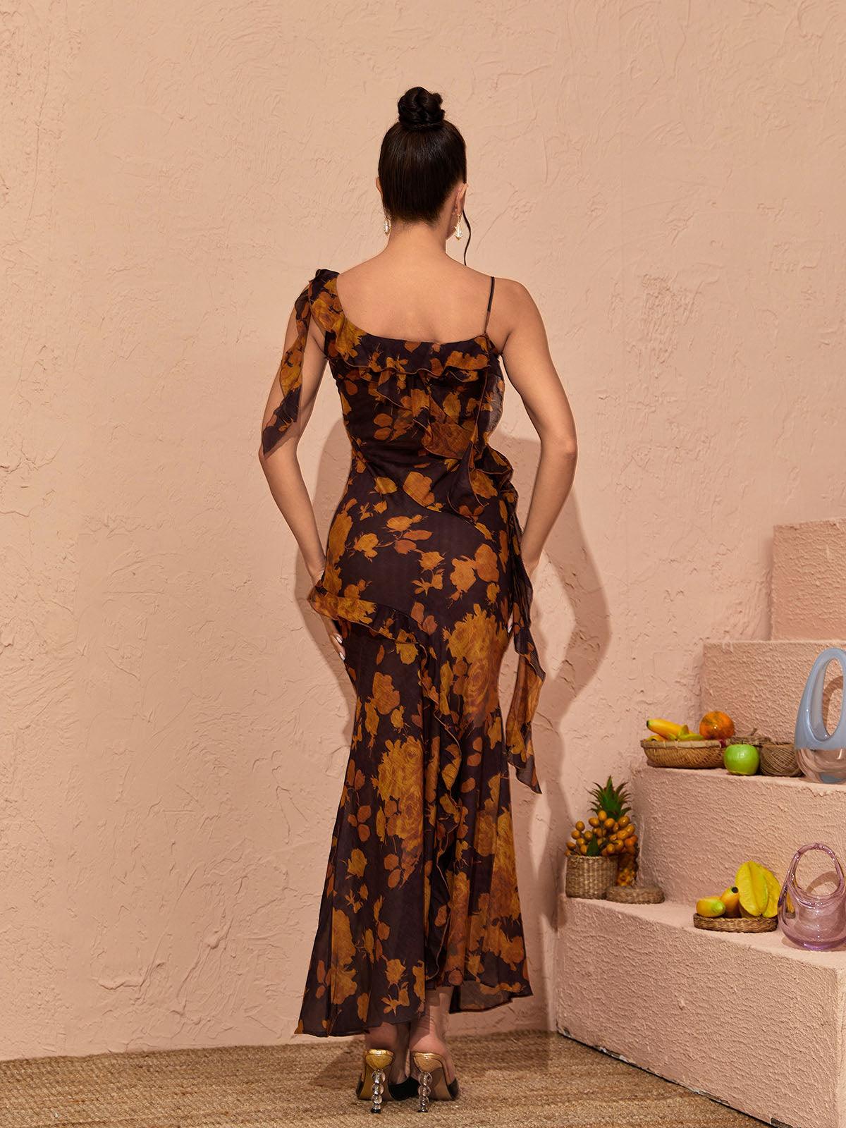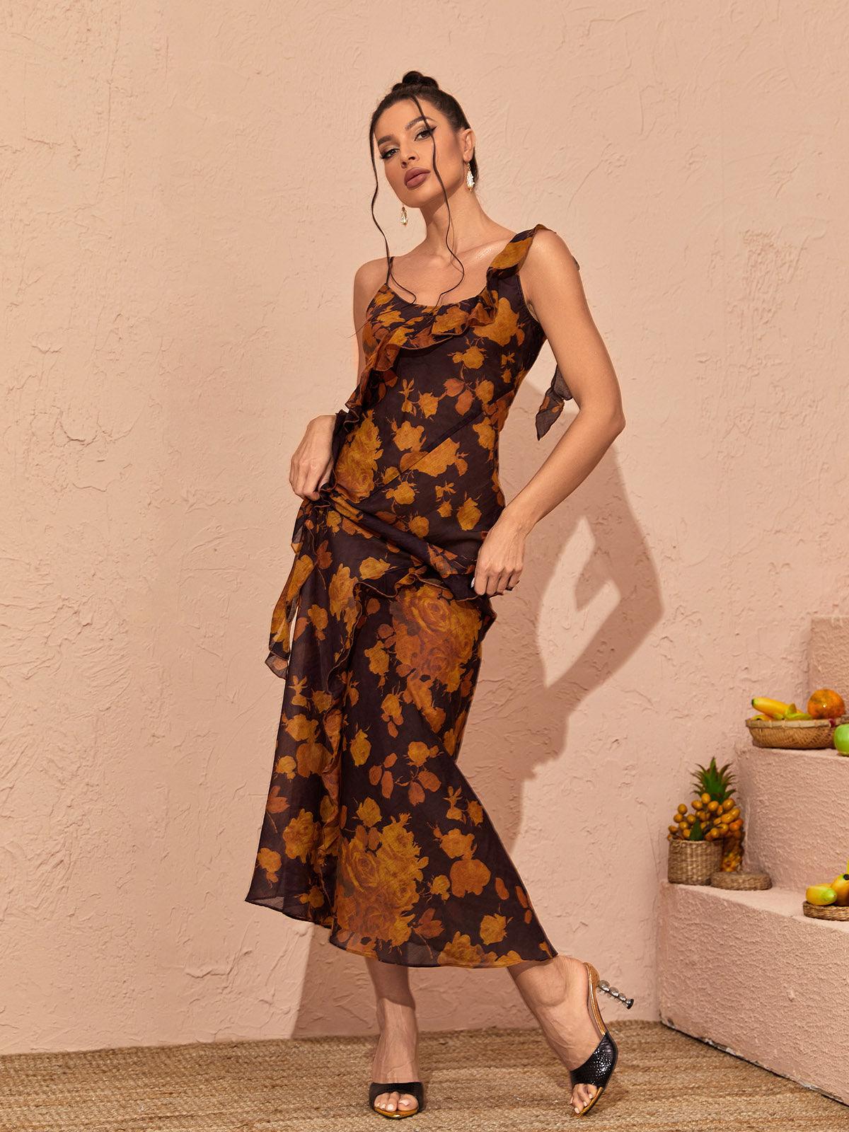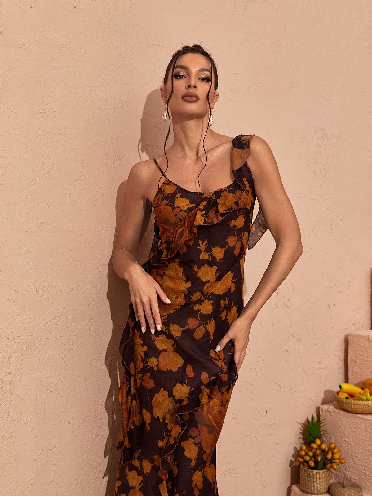 Zuri Fırfırlı Çiçek Baskılı Maxi Elbise